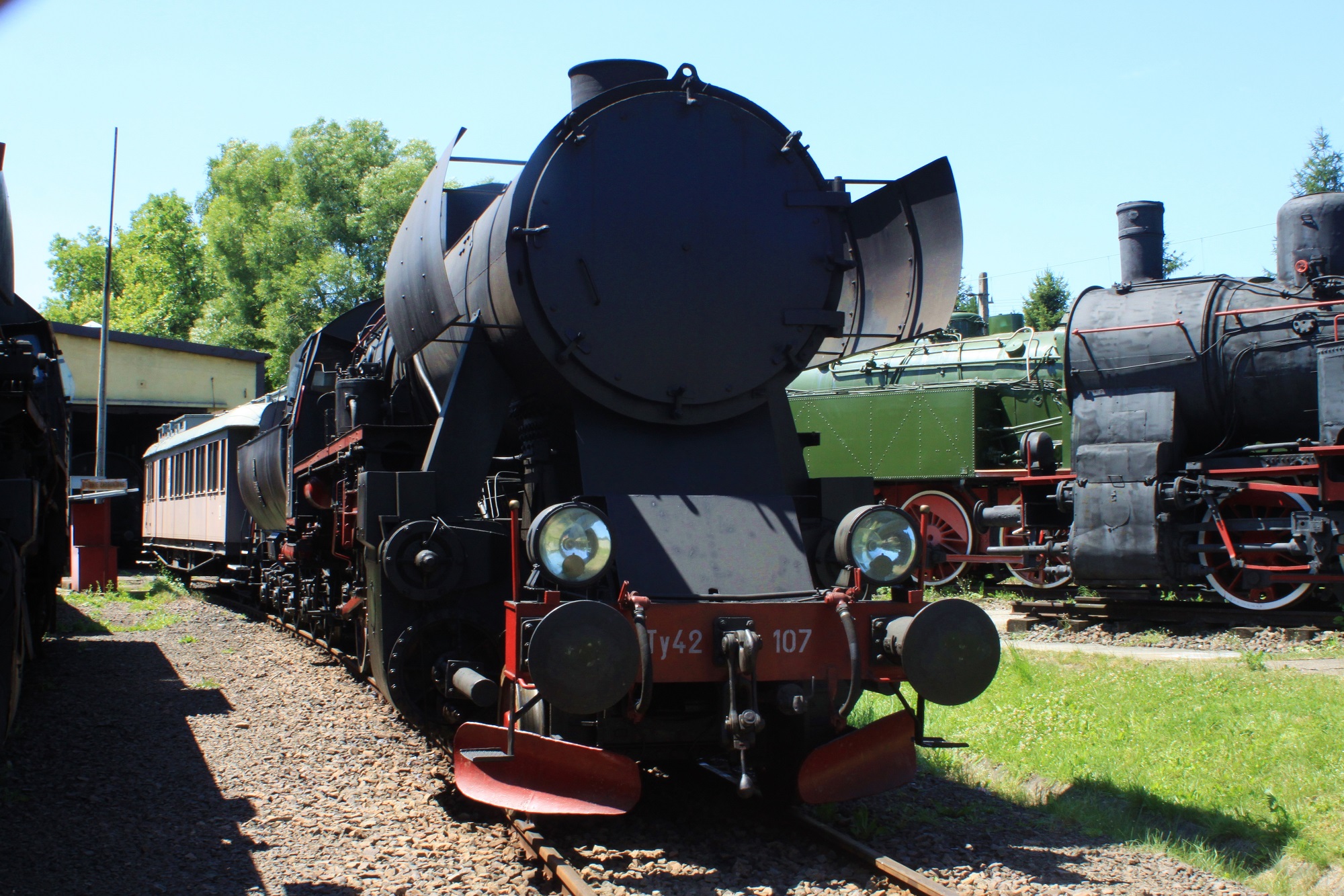 Ty42-107 „składowany” po wschodniej stronie hali warsztatowej. (Chabówka, 2013-07-09) |