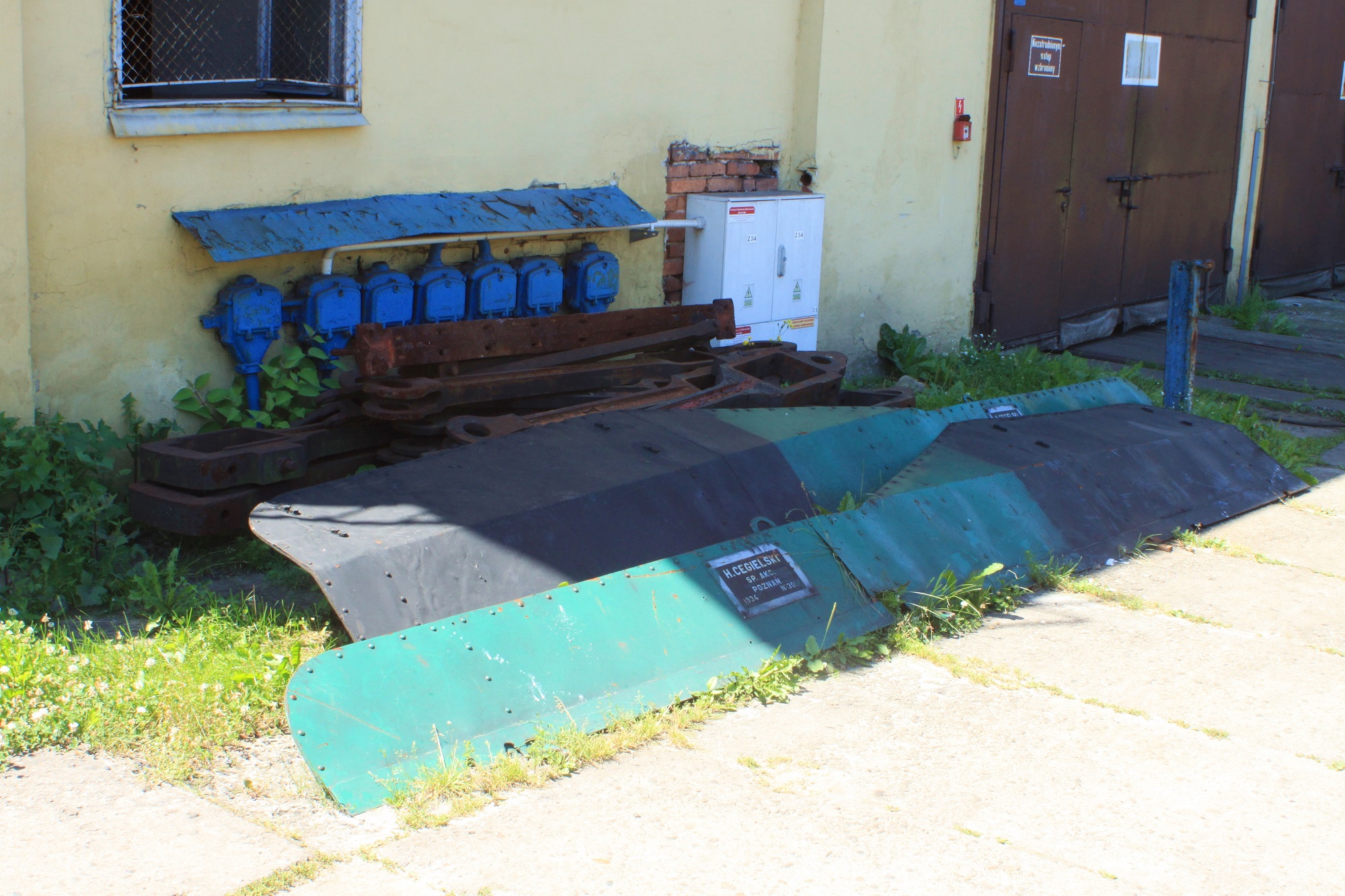 Odchylacze i wiązary składowane „pod chmurką”, po wschodniej stronie hali. Trwa naprawa główna lokomotywy. (Chabówka, 2013-07-09) |