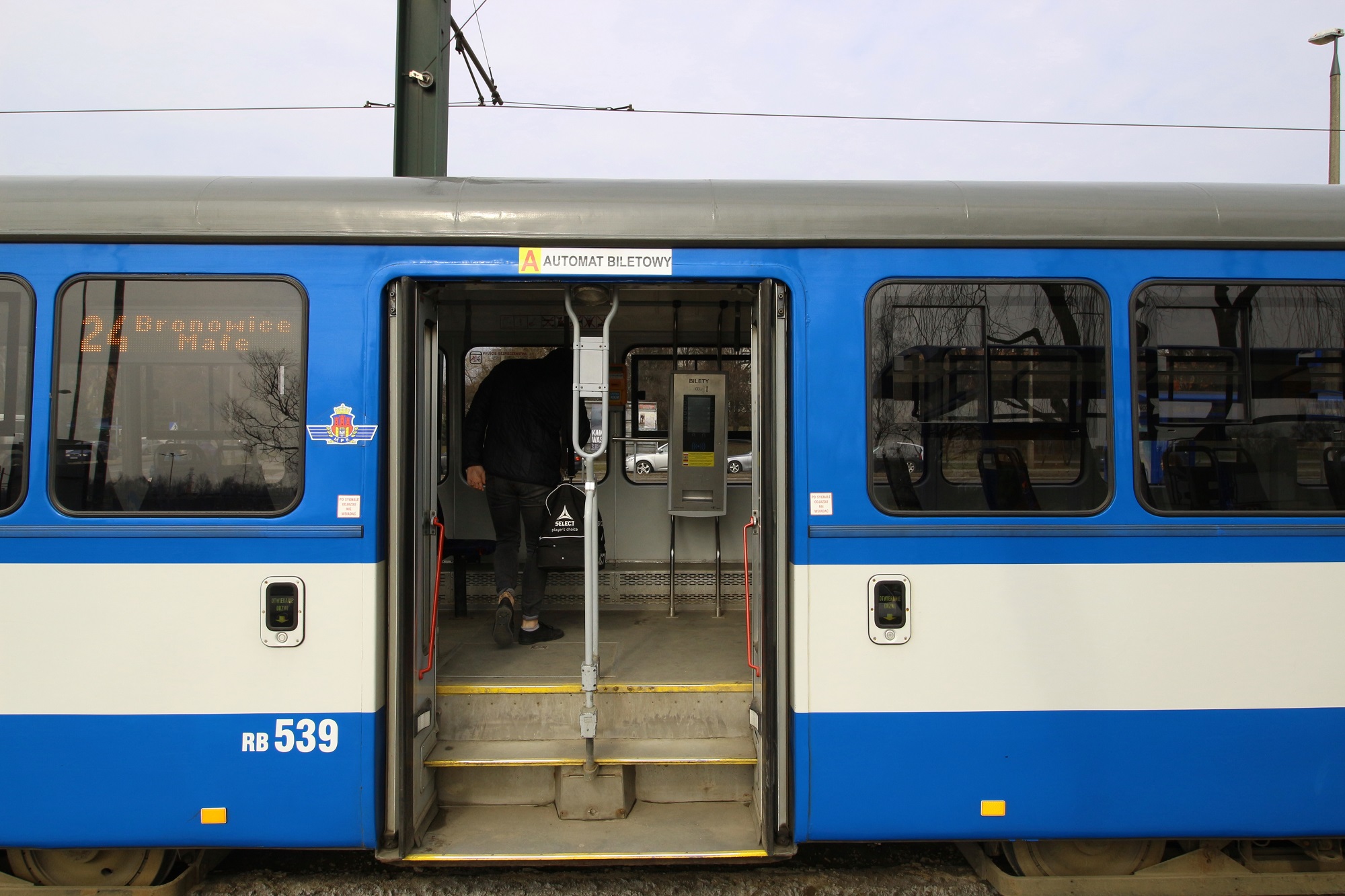 Do niedawna doczepy wiedeńskie nie były doposażane w biletomaty. Masowa kasacja wozów 105Na spowodowała, że automaty ze stopiątek zaczęto montować w c1. E1 #RW139 + c1 #RB539 gotowy do odjazdu na lini 24. (Kraków, Kurdwanów P+R 2018-03-28) |