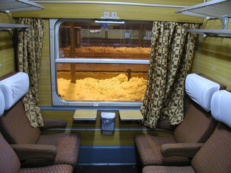 Klasyczny wystrój wnętrza przedziału wagonu 112A pierwszej klasy PKP, charakterystyczna tapicerka i tkanina zasłonek. Wagon Adn w składzie pociągu pospiesznego P32102 "Sztygar" do Lublina. (Kraków Płaszów 2006-01-11) |
