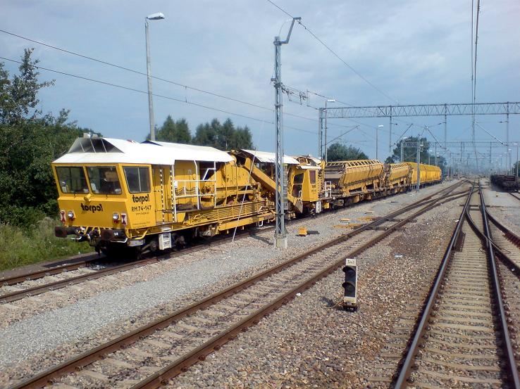 RM74-147, należący do Torpolu skÅ‚ad do czyszczenia podsypki. Modernizacja linii Warszawa – Trójmiasto. (Nasielsk 2009-08-17) |