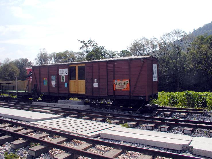 Wagon kryty Kolejki Czernochronskiej, w którym zorganizowano punkt informacyjny i kasę na stacji w Chvatimechu. (2004-07-15) |