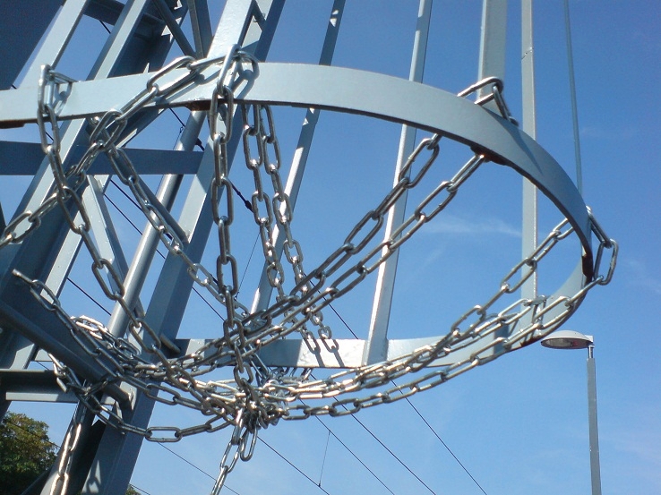 Z powodu niedostępności kilku krawędzi peronowych podczas remontu stacji, przedłużono peron 4 tymczasową platformą. Na skutek tego w zasięgu postronnych osób znalazła się drabinka na bramce trakcyjnej, którą zabezpieczono w dość oryginalny, acz skuteczny sposób. (Wrocław Główny 2011-09-03) |
