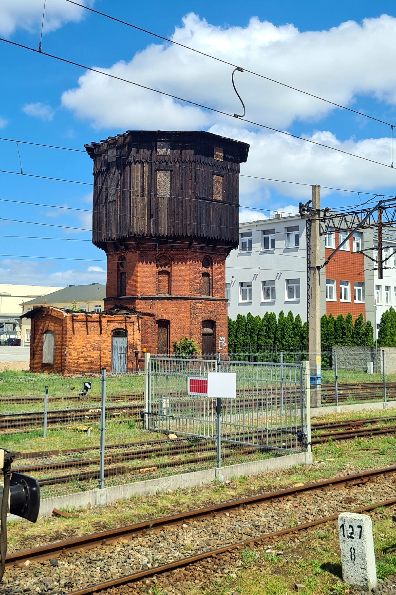 Wieża wodna w sąsiedztwie peronu 5, jeden z niewielu już pozostałych obiektów w rejonie stacji, które służyły do obsługi trakcji parowej. (Bydgoszcz Główna, 2025-06-30) |