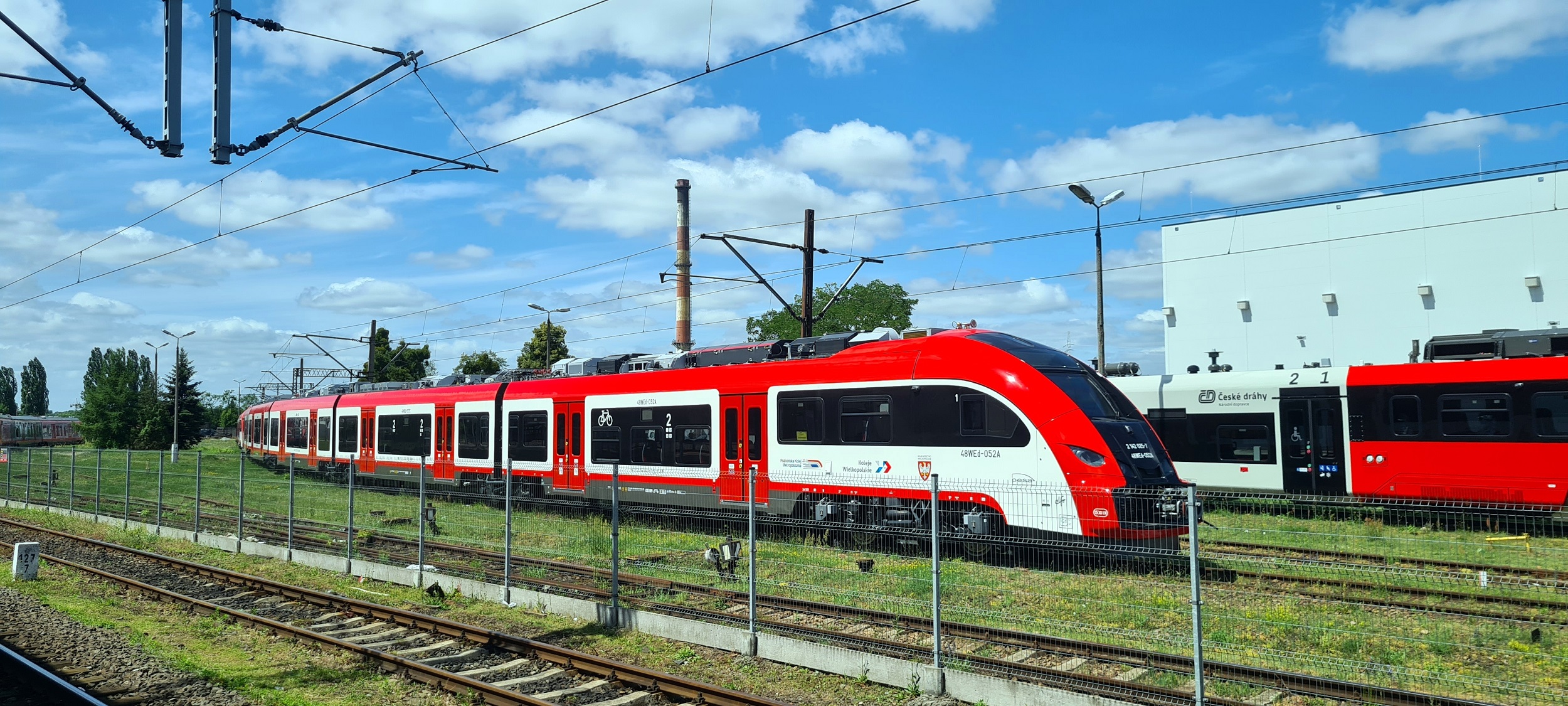 Za płotem zakładów PESA czeka nowy 48WEd-052 dla KW. (Bydgoszcz Główna, 2025-06-30) |