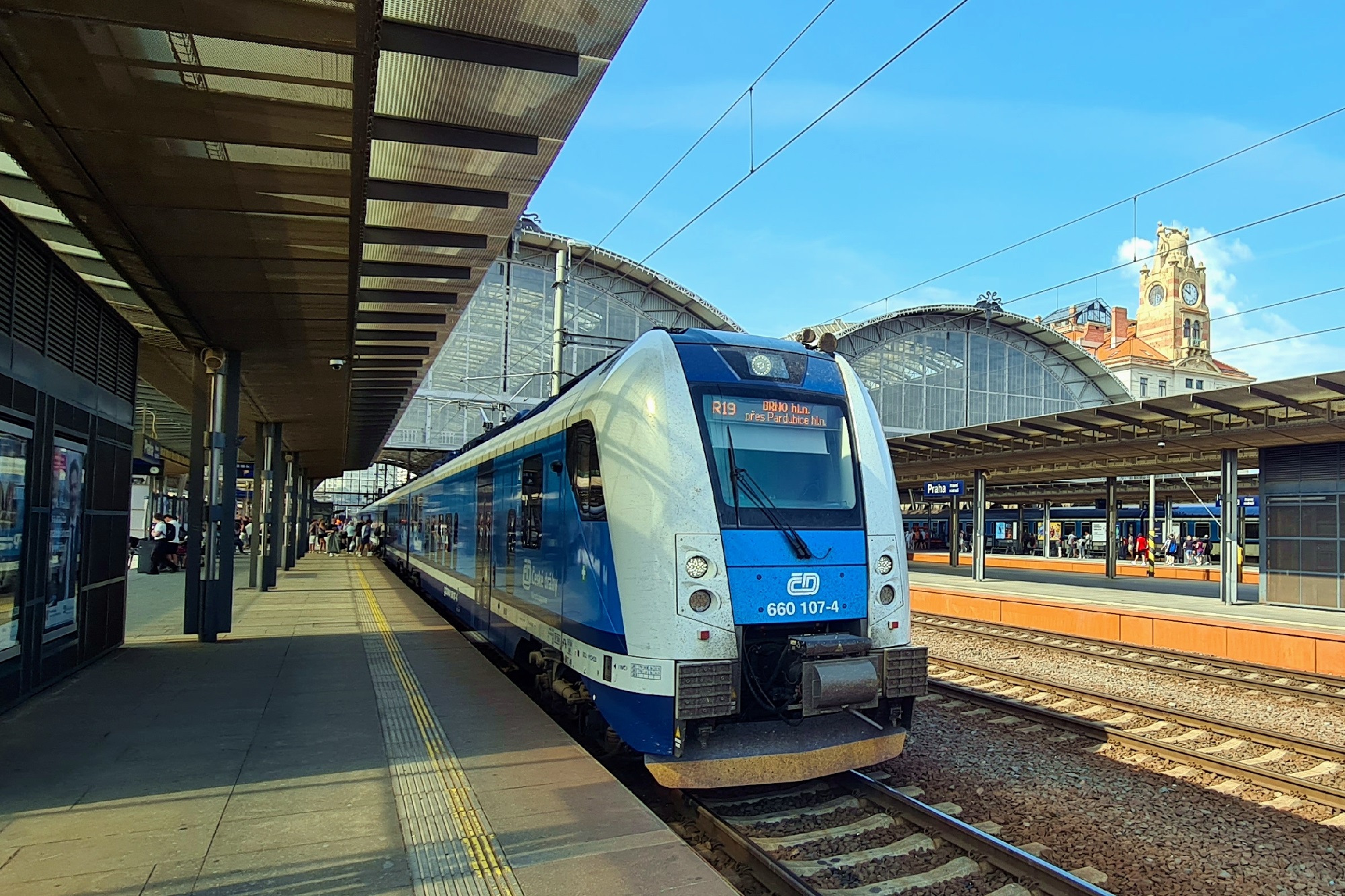 Jednostka 660 107-4 jako pociÄ…g R19 do Brna hl. n., przez Pardubice. (Praha hl. n., 2025-07-05) |