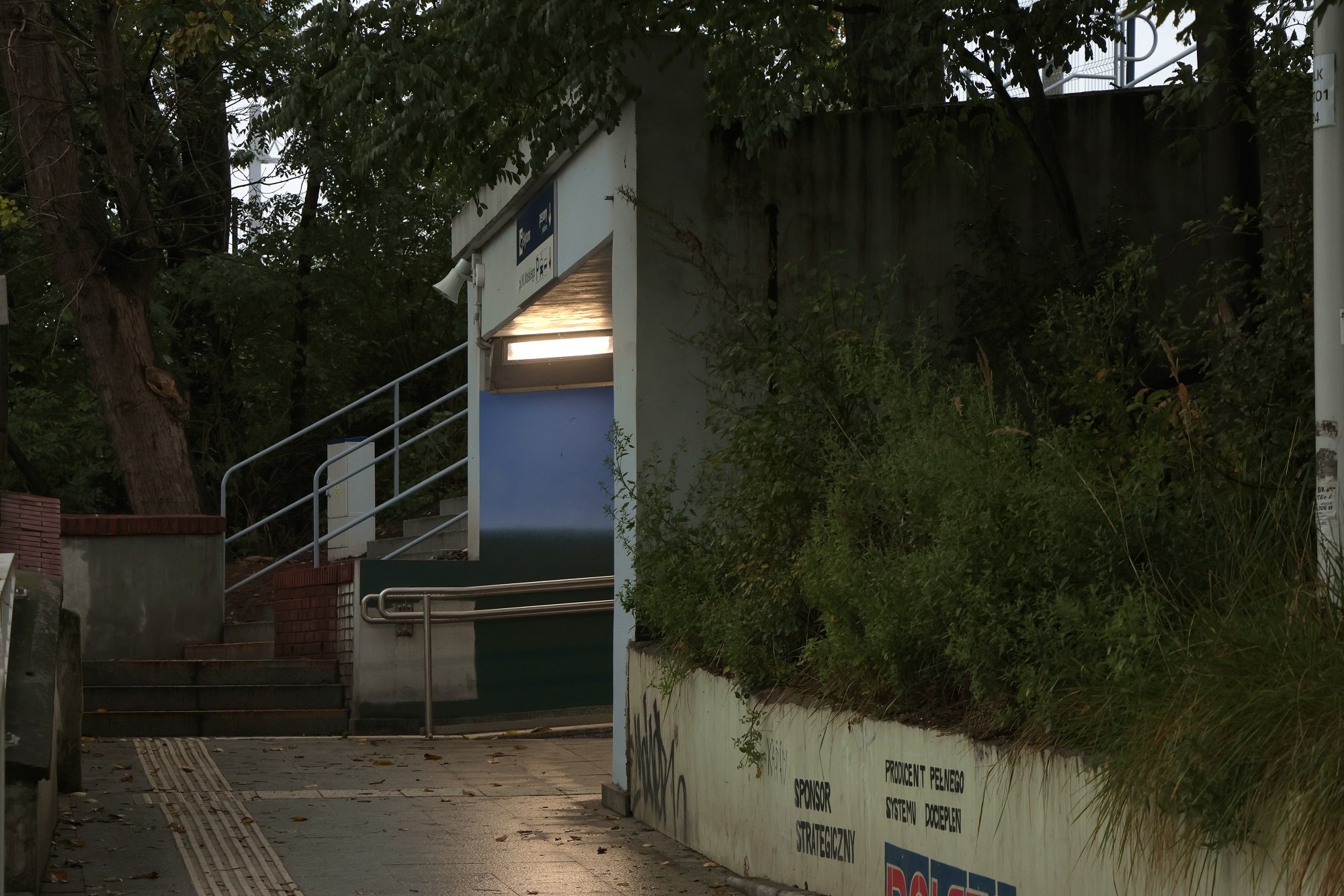 Południowy wylot zachodniego tunelu pod peronami stacji normalnotorowej i schody na peron GKW, w sąsiedztwie przystanku tramwajowego Bytom Zamłynie. (Bytom, 2025-10-12) |