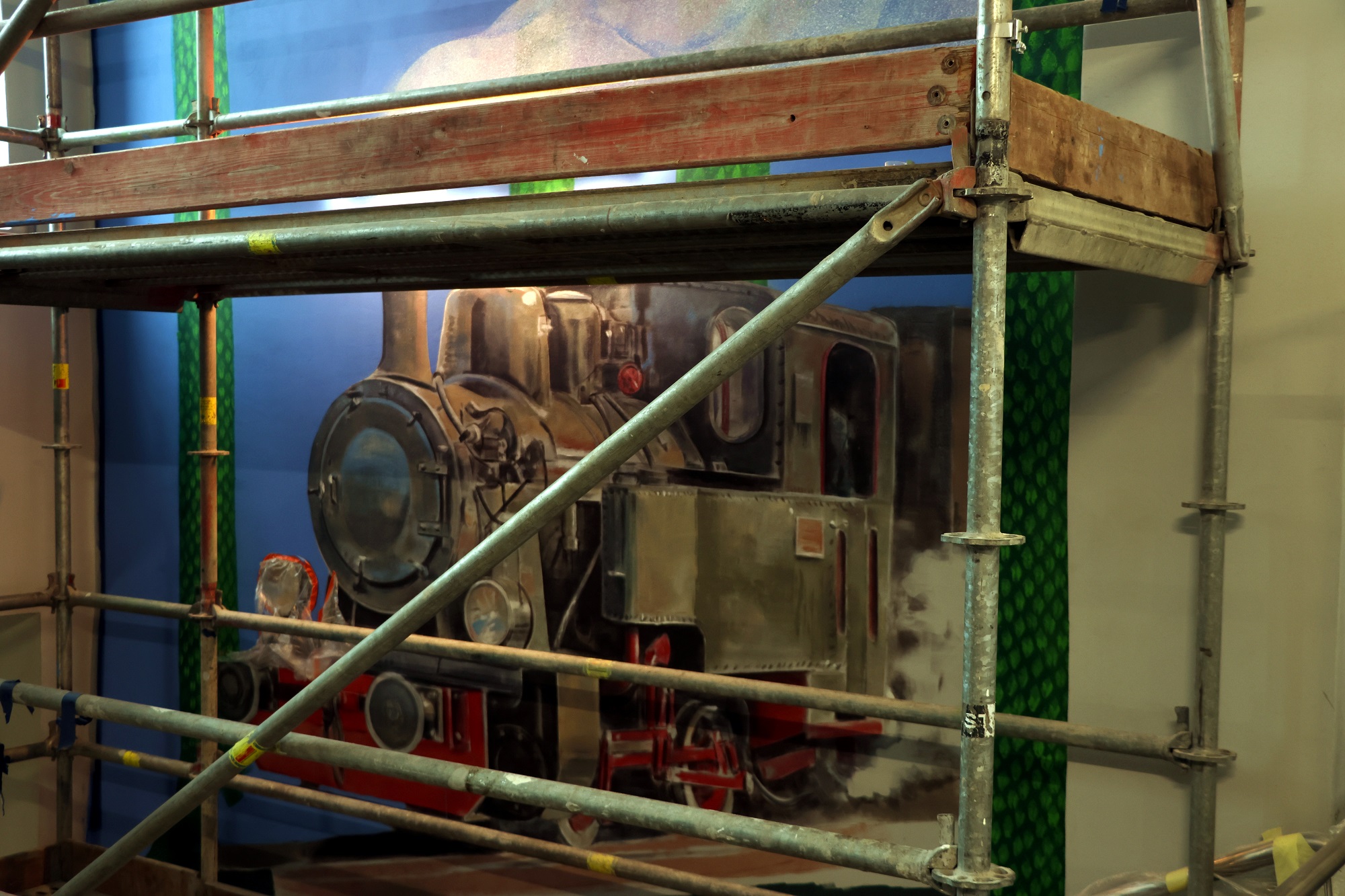 Jedno z malowideł w zachodnim tunelu pod peronami, a dokładniej na ścianie zejścia od strony placu Wolskiego. Praca przedstawia parowóz Tkb27-2002. (Bytom, 2025-10-12) |
