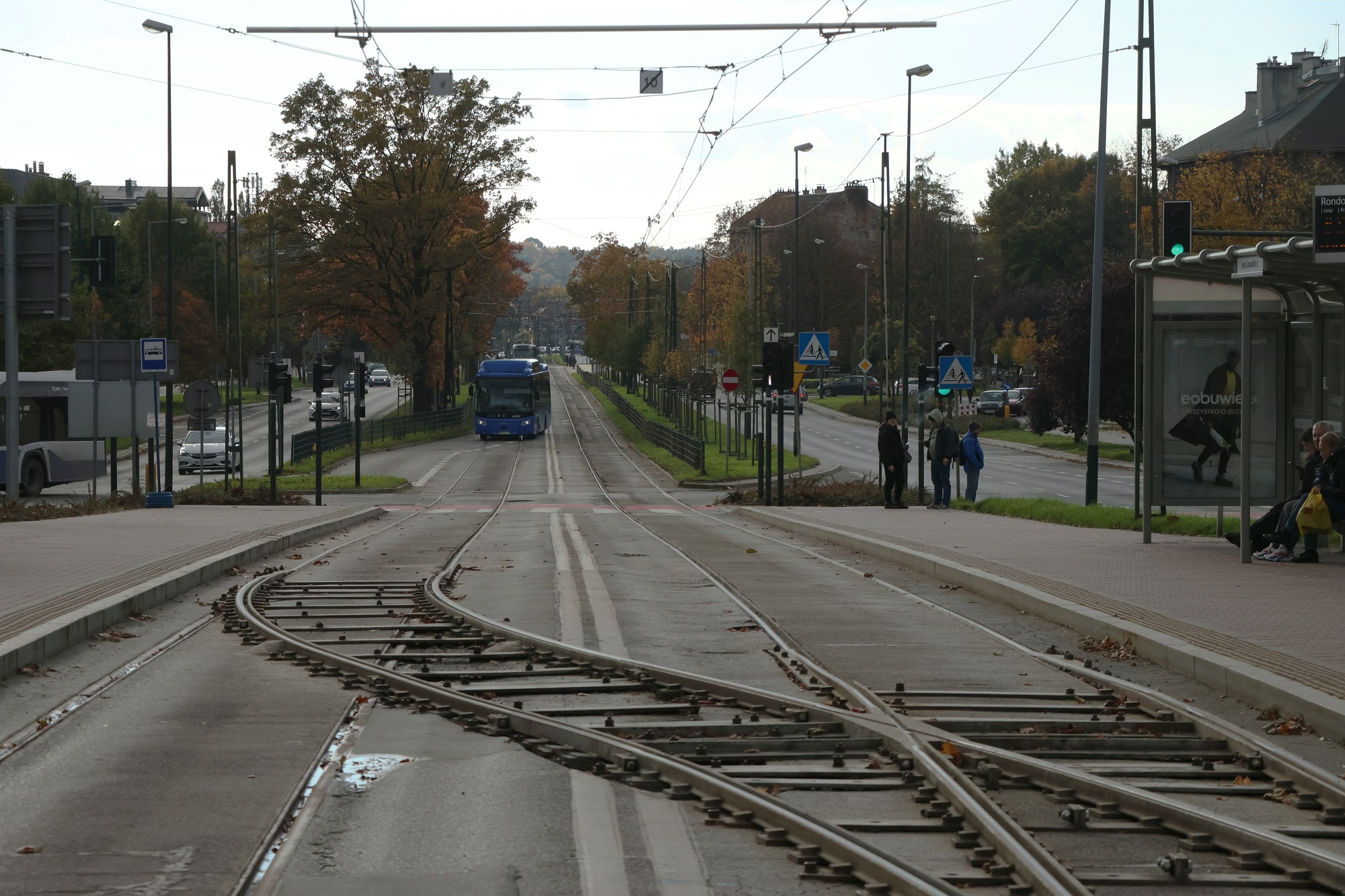 Z powodu pilnego remontu Mostu Grunwaldzkiego, tramwaje jadące ulicą Monte Cassino nie mogły przekraczać Wisły i kończyły bieg na przystanku Rondo Grunwaldzkie. By było to technicznie wykonalne, skierowano do obsługi jedynej dojeżdżającej tu linii nr 72 tramwaje dwukierunkowe i zainstalowano tymczasowe rozjazdy nakładkowe. Dzień wykonania fotografii był ostatnim, w którym obowiązywała taka tymczasowa organizacja ruchu. W poniedziałek 20 października rozpoczęto demontaż nakładki torowej i prace przy podłączeniu nowego torowiska na moście do torów w Monte Cassino. (Kraków, 2025-10-19) |