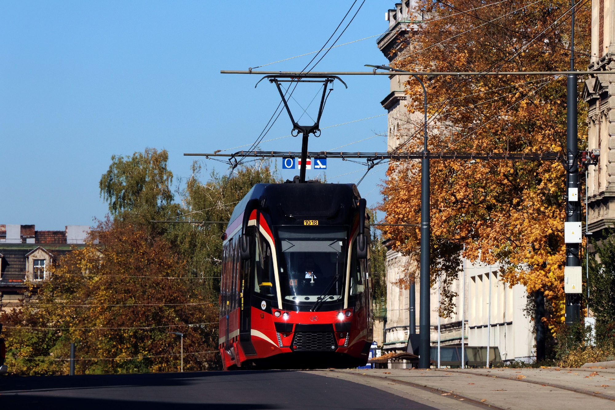 #1018 na linii 34 wspina się ulicą Powstańców w stronę dworca kolejowego. (Mysłowice, 2025-10-20) |