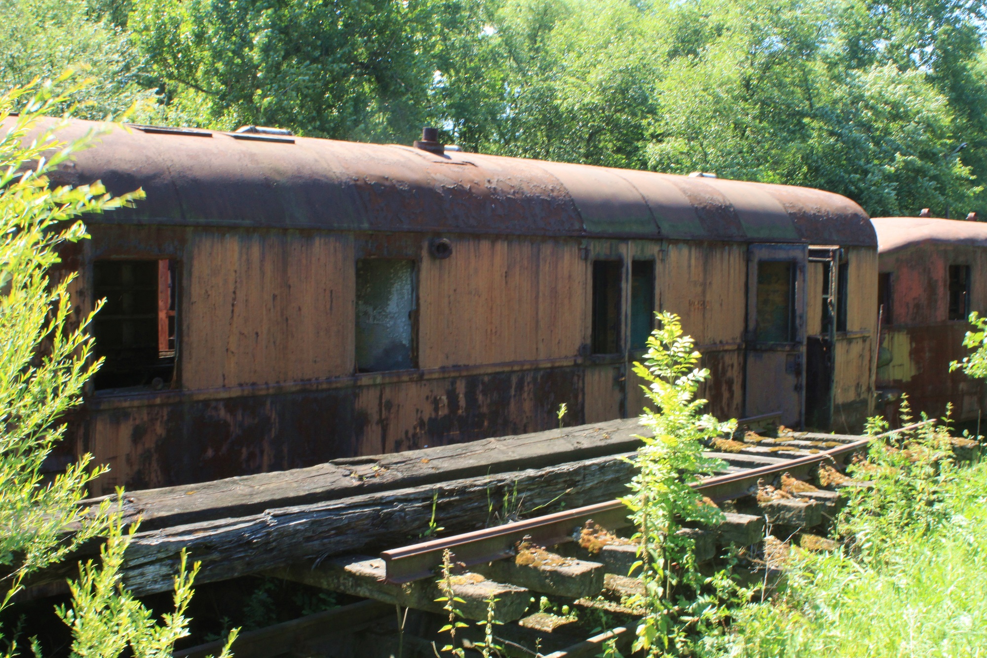 Ambulans pocztowy 50 51 00-34 105-6 Pm, czekający na zapleczu warsztatów na lepsze czasy. (Chabówka, 2013-07-09) |