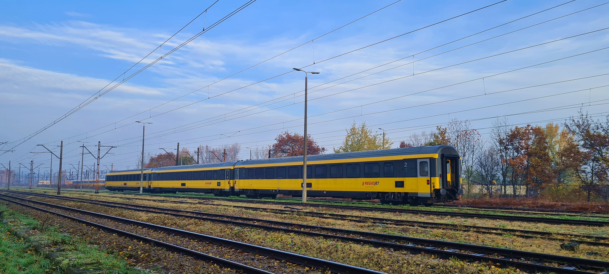 Od 18 września tego roku RegioJet uruchamia jedną parę pociągów relacji Kraków Główny – Warszawa Wschodnia – Kraków Główny, przez Zawiercie. Początkowo skład był zestawiony z ośmiu wagonów, w dniu wykonywania zdjęcia liczył tylko pięć (obrządzany skład widoczny w oddali po lewej stronie kadru), a trzy niewykorzystywane stały odstawione.  (Kraków Prokocim Towarowy, 2025-11-01) |