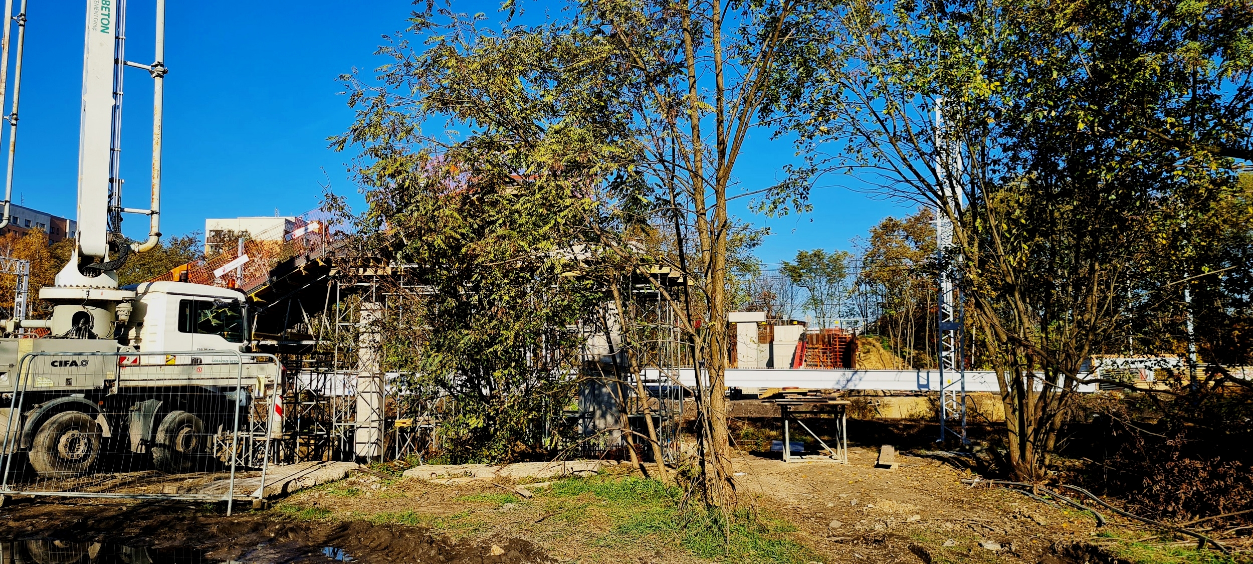 W odróżnieniu od poprzedniczki, ta będzie miała zaledwie dwa przęsła. Widoczna podpora po południowej stronie torów, druga na międzytorzu i wbudowany w skarpę przyczółek północny. (Katowice Załęże, 2025-11-06) |