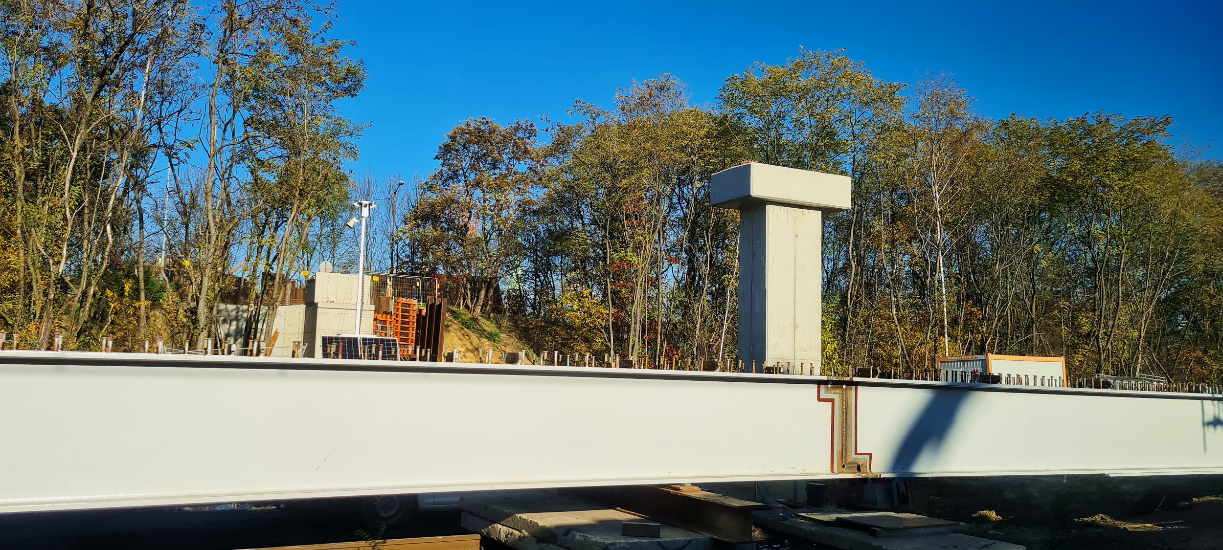 W tle budowany jest północny przyczółek. Na pierwszym planie podpora i leżące na ziemi jedno z przęseł. (Katowice Załęże, 2025-11-06) |