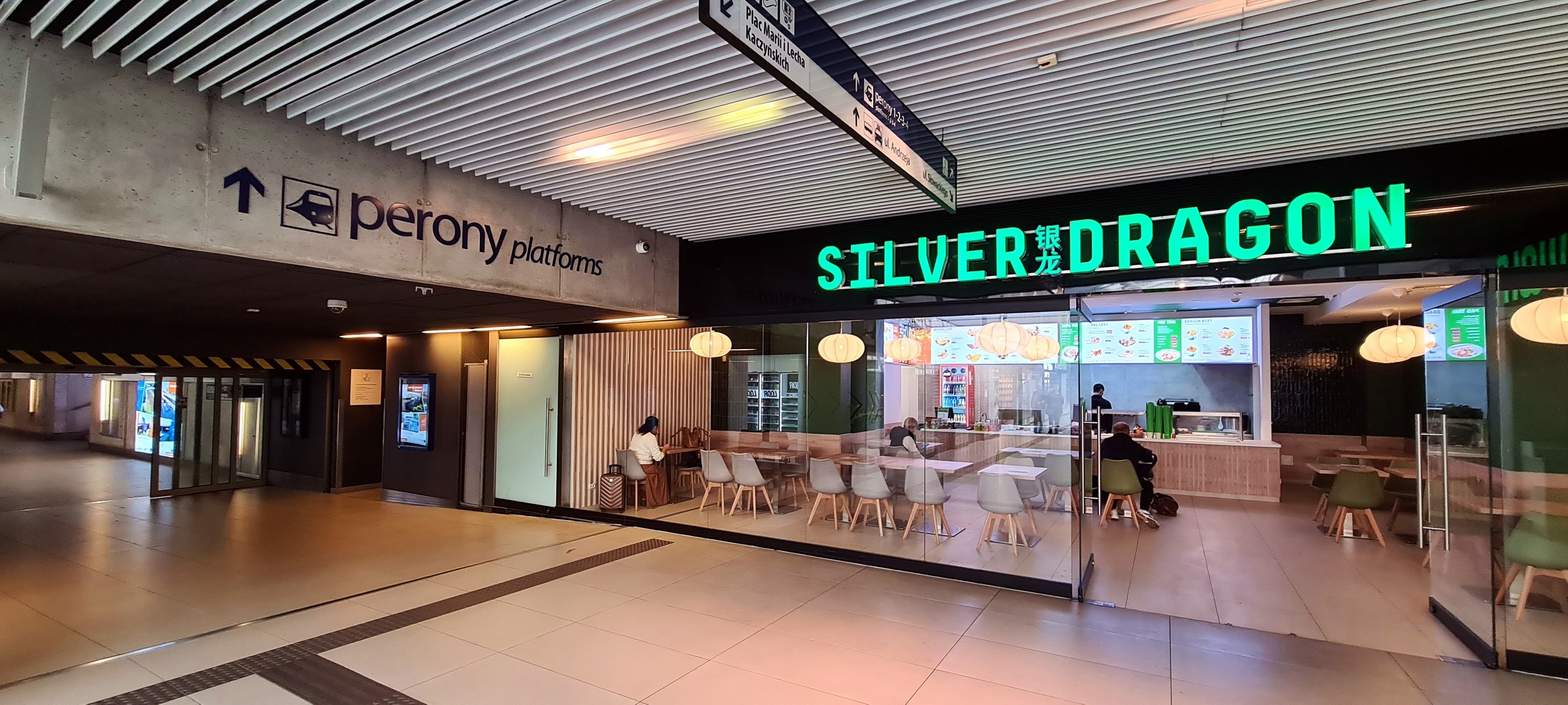 Zachodni kraniec holu dworcowego. W kadrze znajduje się miejsce, w którym powstanie wejście do tunelu w stronę ulicy Mikołowskiej. Jest to (najprawdopodobniej) ściana na lewo od baru. (Katowice, 2025-11-06) |