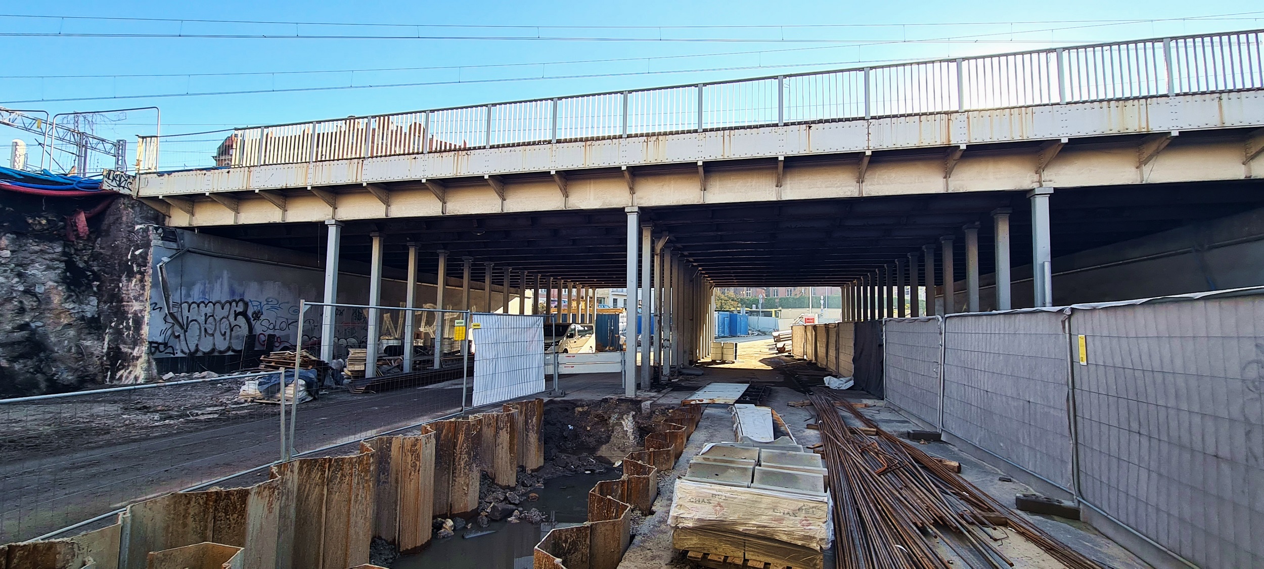 Południowy wiadukt wciąż stoi niemal nienaruszony. W dotychczasowej luce pomiędzy wiaduktami widoczne ścianki szczelne, będące zaczątkiem podpory kolejnej części nowego obiektu. (Katowice, 2025-11-06) |