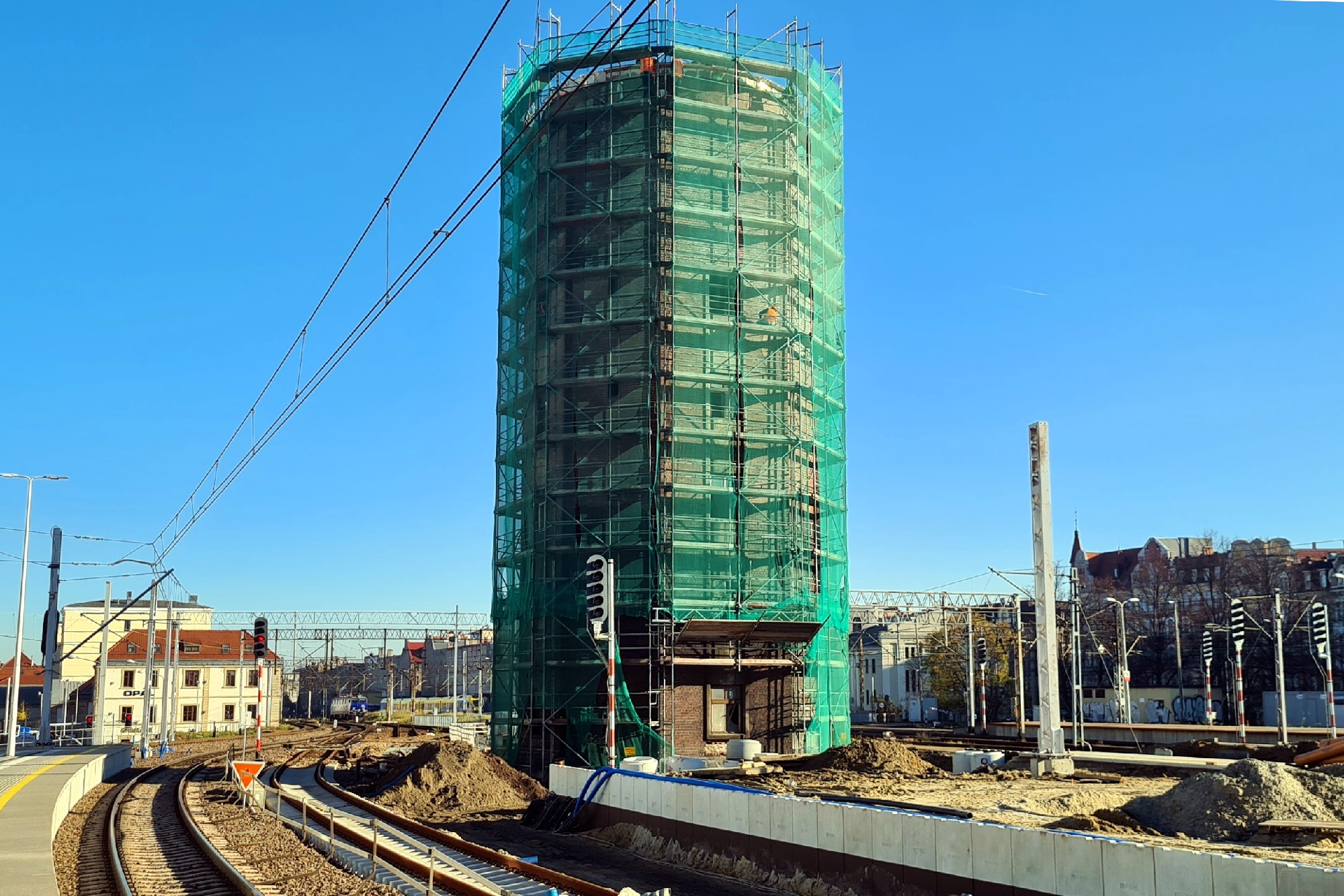 Widok na wschodni kraniec przebudowywanego peronu 2, oraz na restaurowaną wieżę ciśnień.