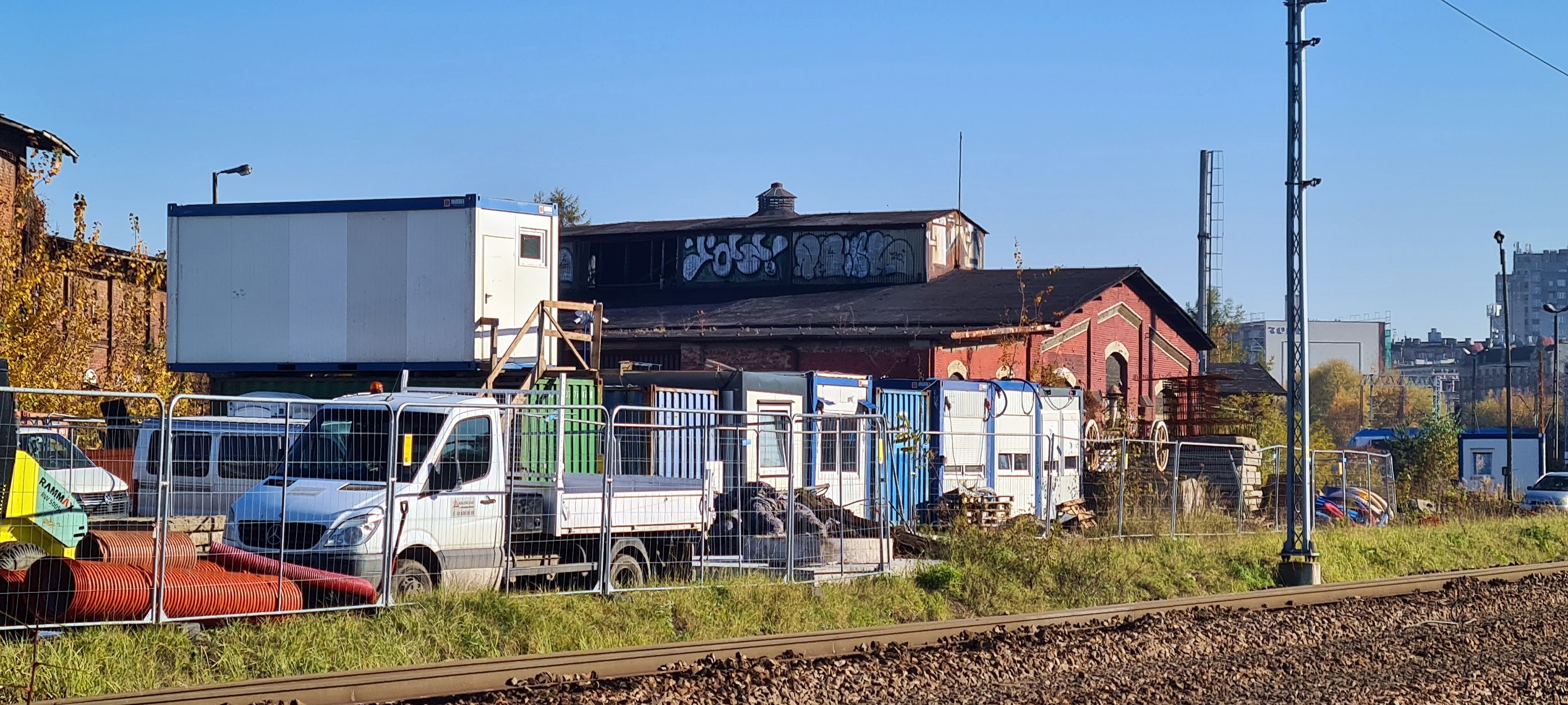 Zaplecze budowy po zachodniej stronie starej parowozowni. (Katowice, 2025-11-06) |