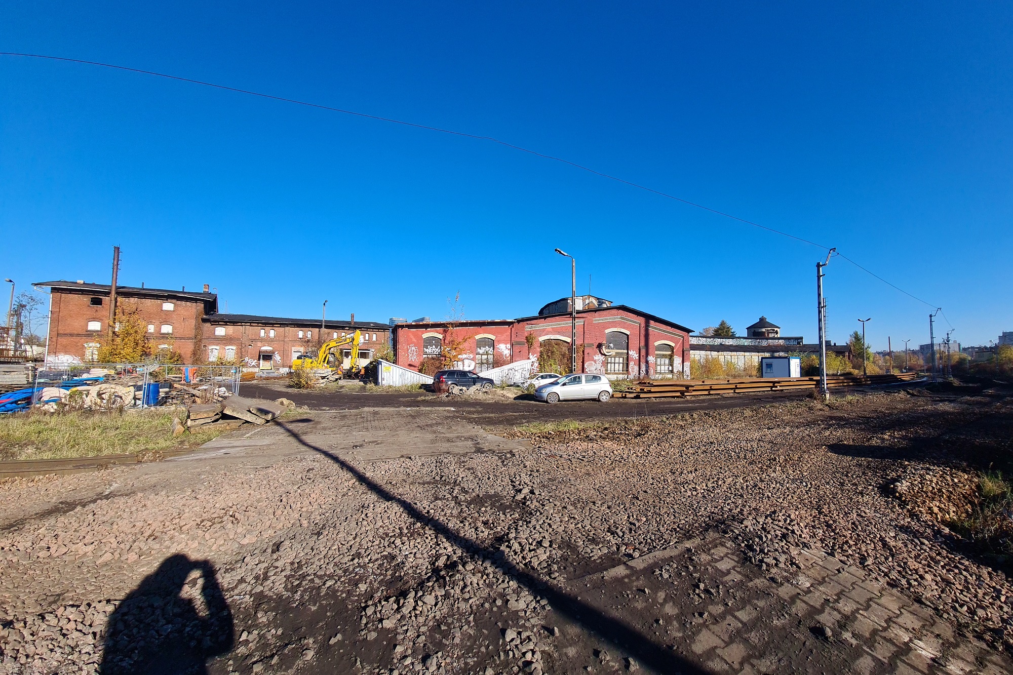 Stara parowozownia, widok od zachodniego krańca, z miejsca dawnego przejazdu przez tory. Widoczny jeszcze bruk nawierzchni drogi i w centrum kadru zadaszenia schodów do tunelu pod torami. (Katowice, 2025-11-06) |