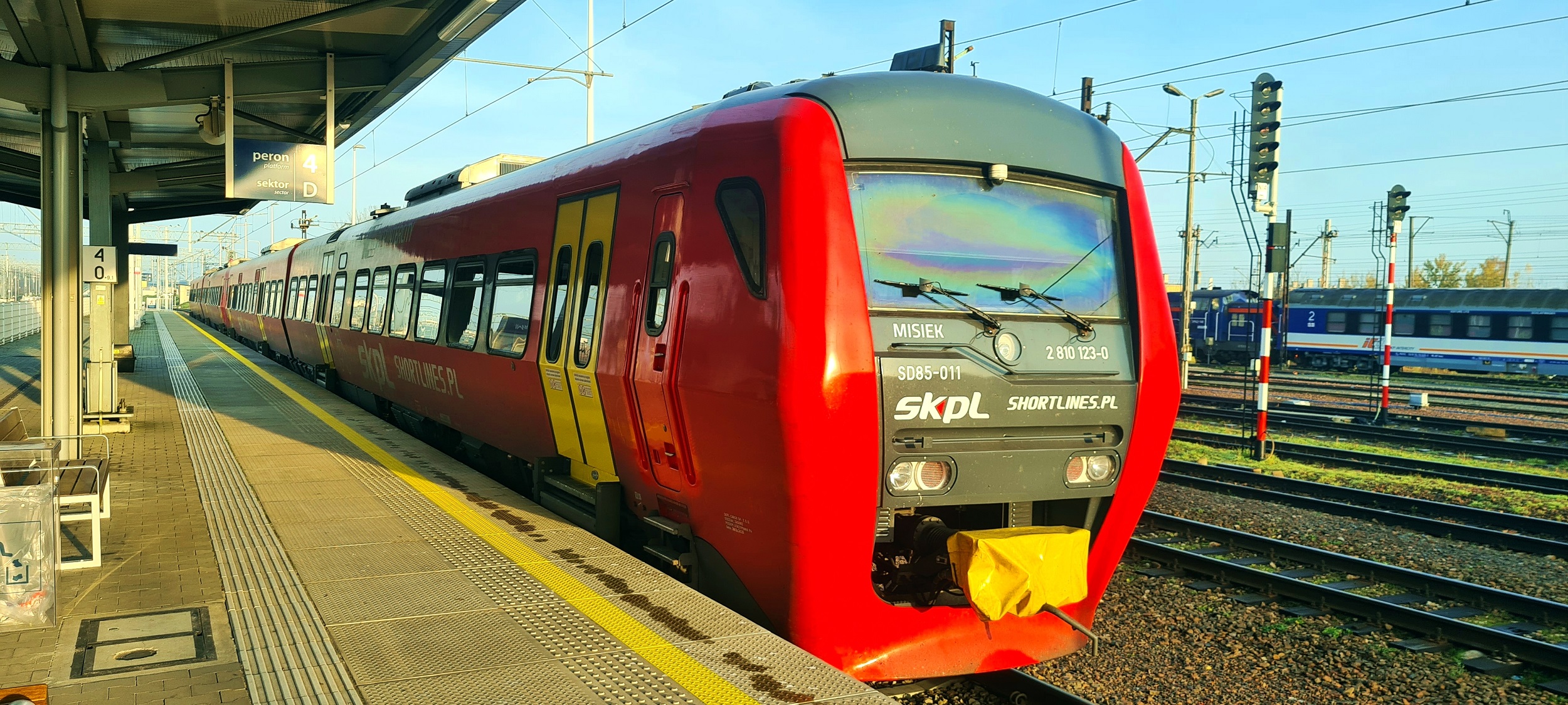 Skład SD85-011 + SD85-009 jako pociąg służbowy do Krakowa Głównego, skąd odjedzie jako pociąg IC32110 „Kasztelan” do stacji Hrubieszów Miasto. (Kraków Płaszów, 2025-11-06) |