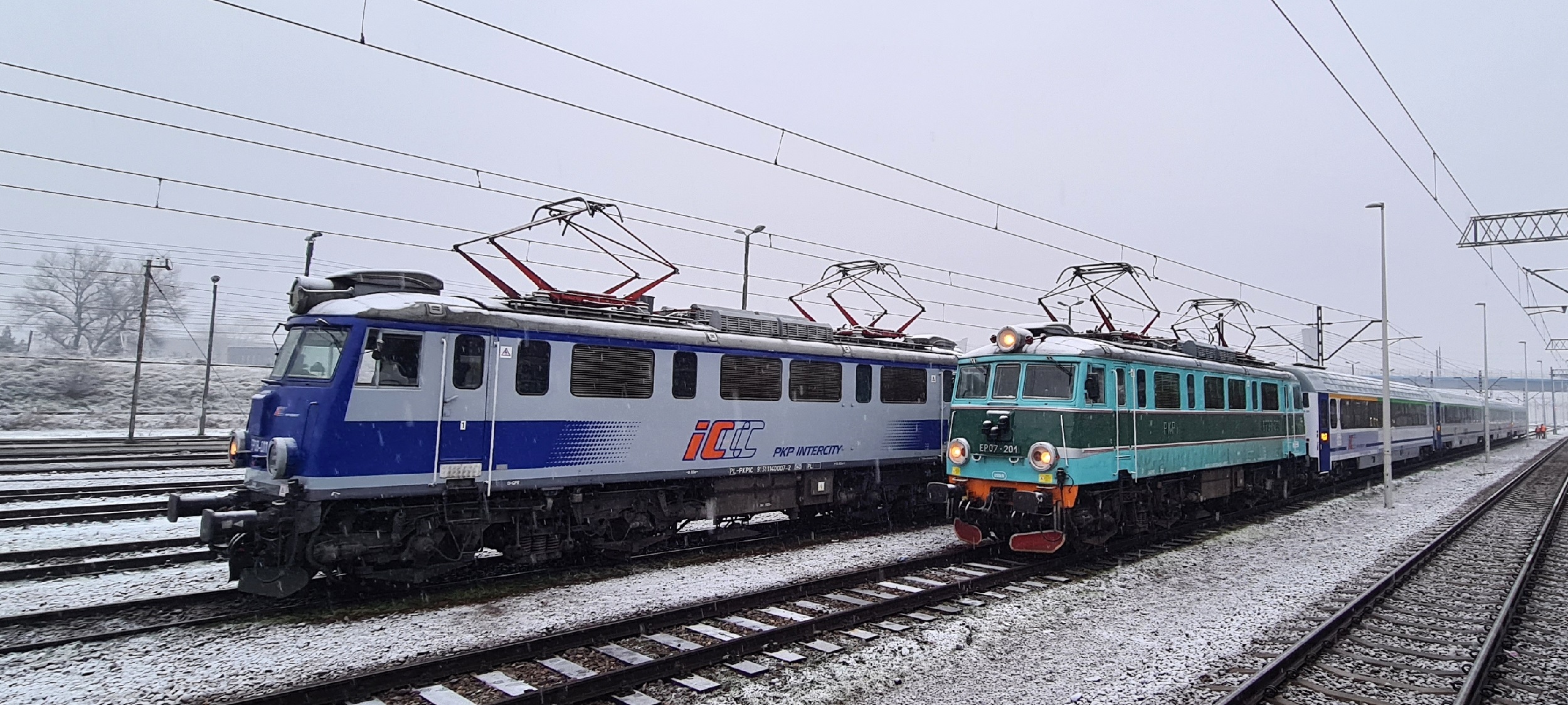 EP08-011 z podsyłem składu na TLK31102 „Marszałek Piłsudski”, relacji Kraków Główny – Warszawa Wschodnia. Obok EU07-201 na IC32106 „Jadwiga”, relacji Kraków Główny - Lublin Główny. (Kraków Płaszów, 2025-11-21) |