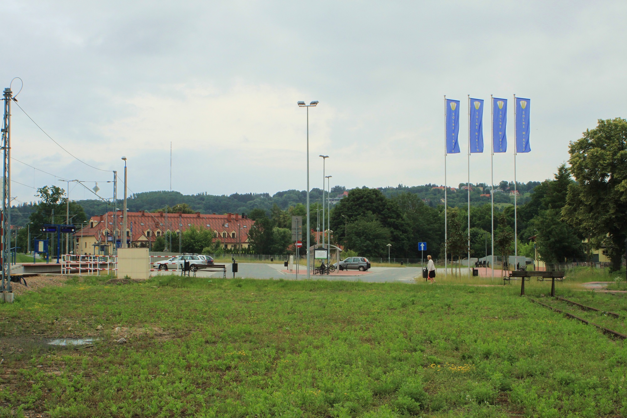 Równia mieszcząca niegdyś tory towarowe. Na pierwszym planie zieleń przed budynkiem dworca, która w późniejszym terminie częściowo zmieni sę w plac zabaw dla dzieci. (Wieliczka Park, 2013-06-27) |