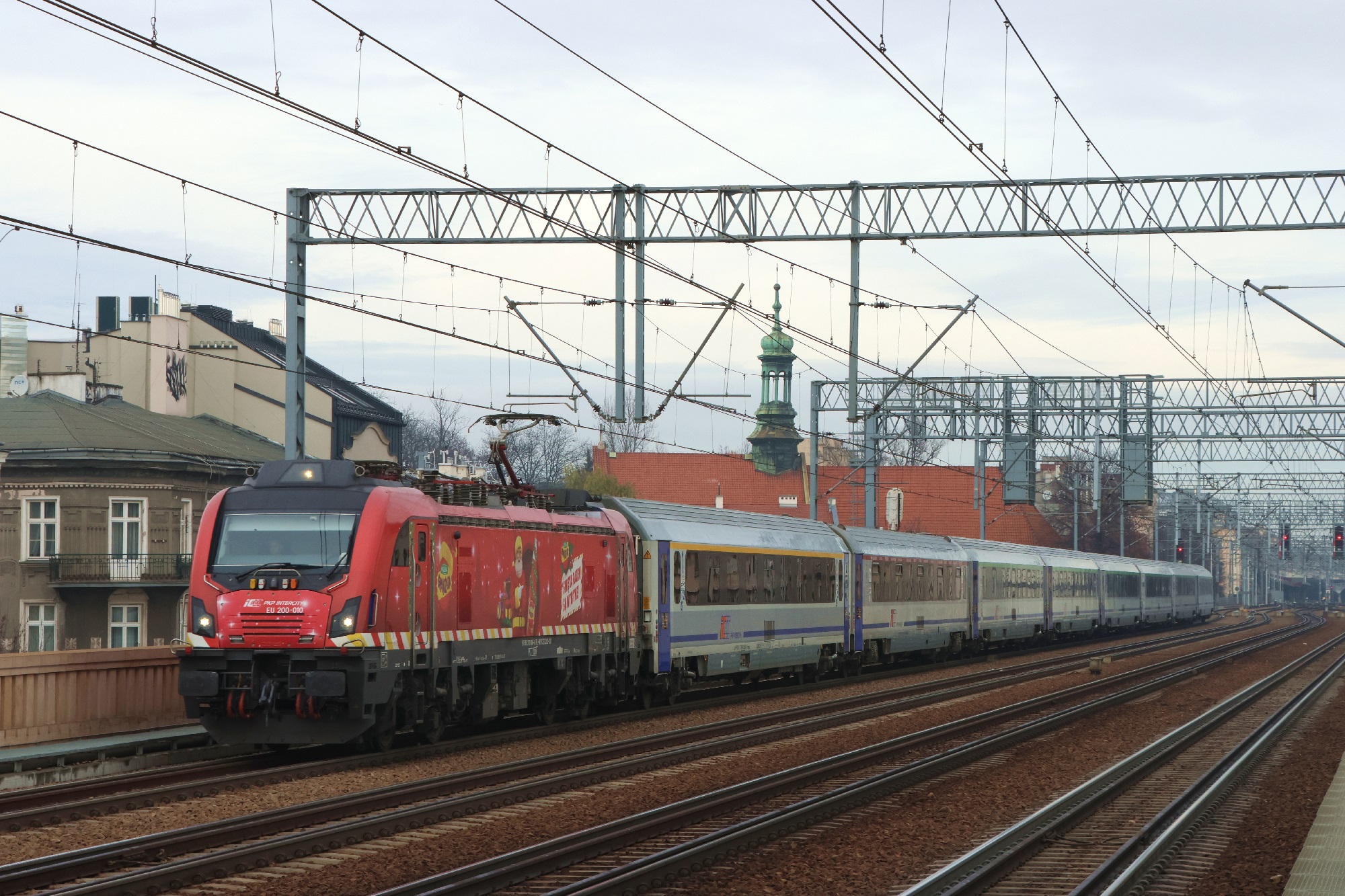 EU200-010 na czele składu pociągu EIC1350 „Tatry”, relacji Warszawa Wschodnia - Zakopane. (Kraków Grzegórzki, 2025-12-08) |