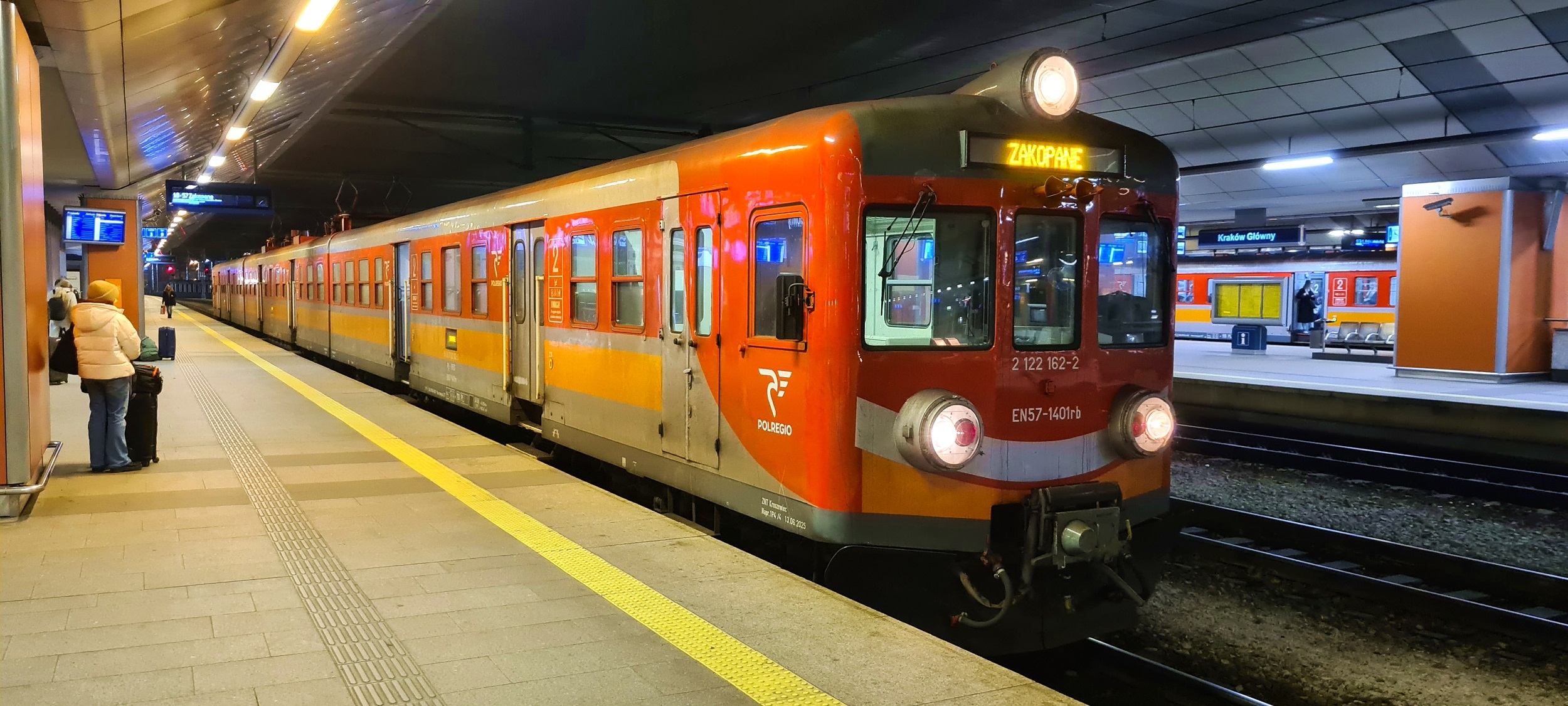 EN57-1401 jako pociąg regio R30515 „Podhale” do Zakopanego. (Kraków Główny, 2025-12-12) |
