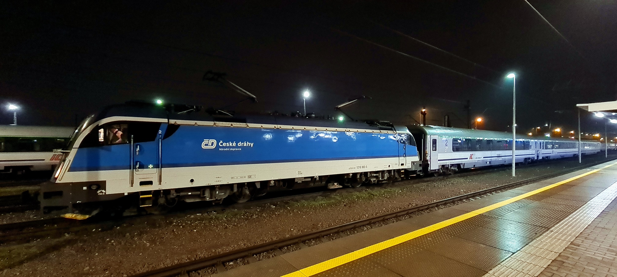 1216 903-5 na czele składu czekającego na podsył do Krakowa Głównego, skąd odjedzie jako IC203 „Danubius”, do stacji Wien Westbahnhof. (Kraków Płaszów, 2025-12-14) |