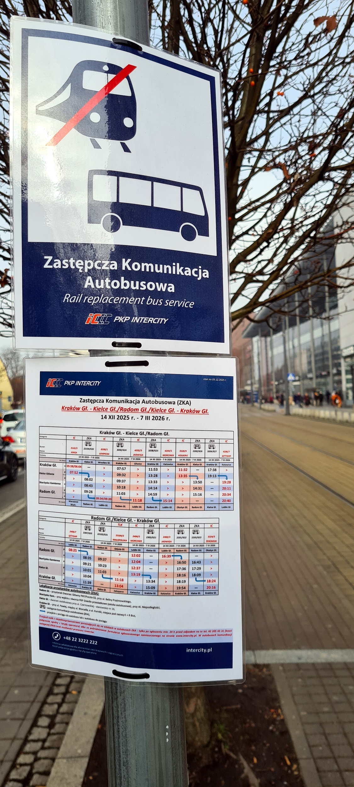 Nioebrendowane autobusy i słupek przystankowy z kartkami formatu A4 na trytytkach nie ułatwiają zbytnio sprawnej identyfikacji miejsca przez podróżnych. Sytuacja ma trwać w terminie od 14 grudnia 2025 do 7marca 2026, spowodowana jest dość chaotycznie prowadzonymi pracami na LK8, zwłaszcza zaś przebudową stacji Kozłów. Swoje dokłada przebudowa krawędzi peronów 4 i 5 w Krakowie Głównym. (Kraków Główny, 2025-12-16) |