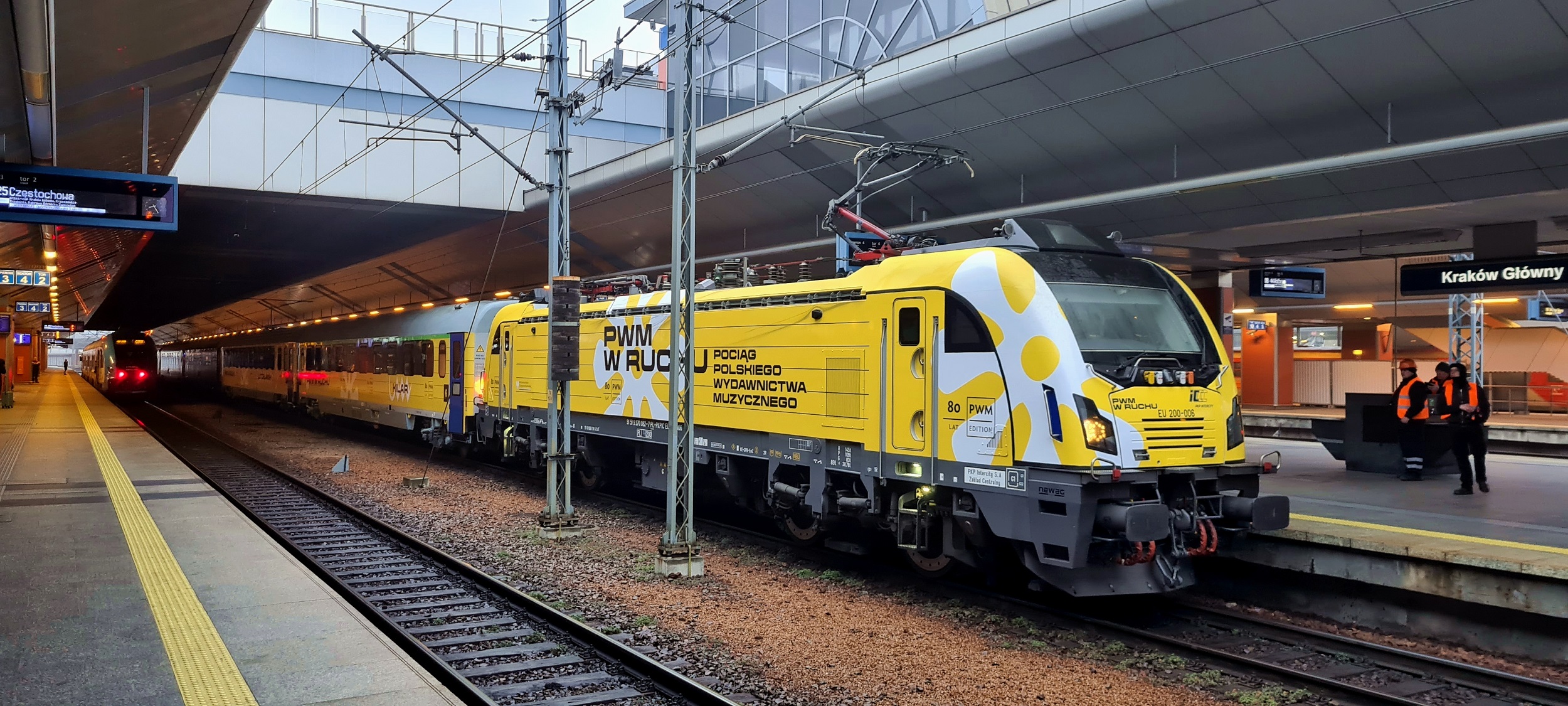 EU200-004 w okleinie „PWM w Ruchu, Pociąg Wypełniony Muzyką”, w składzie pociągu specjalnego, uruchomionego z okazji 80 rocznicy powstania Polskiego Wydawnictwa Muzycznego. Przejazd odbędzie się na trasie Kraków Główny – Gdynia Główna, przez między innymi Częstochowę, Zduńską Wolę Karsznice, Łódź Widzew, Warszawę Centralną, Iławę Główną i Gdańsk Główny. (Kraków Główny, 2025-12-21) |