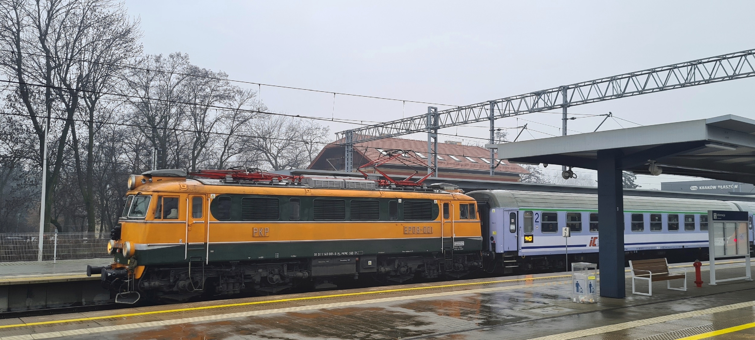 EP08-001 na czele zastępczego składu wagonowego, pociągu IC30112 „Bieszczady”. Relacja została skrócona do Krosna, z powodu remontu infrastruktury na linii 108. (Kraków Płaszów, 2025-12-21) |