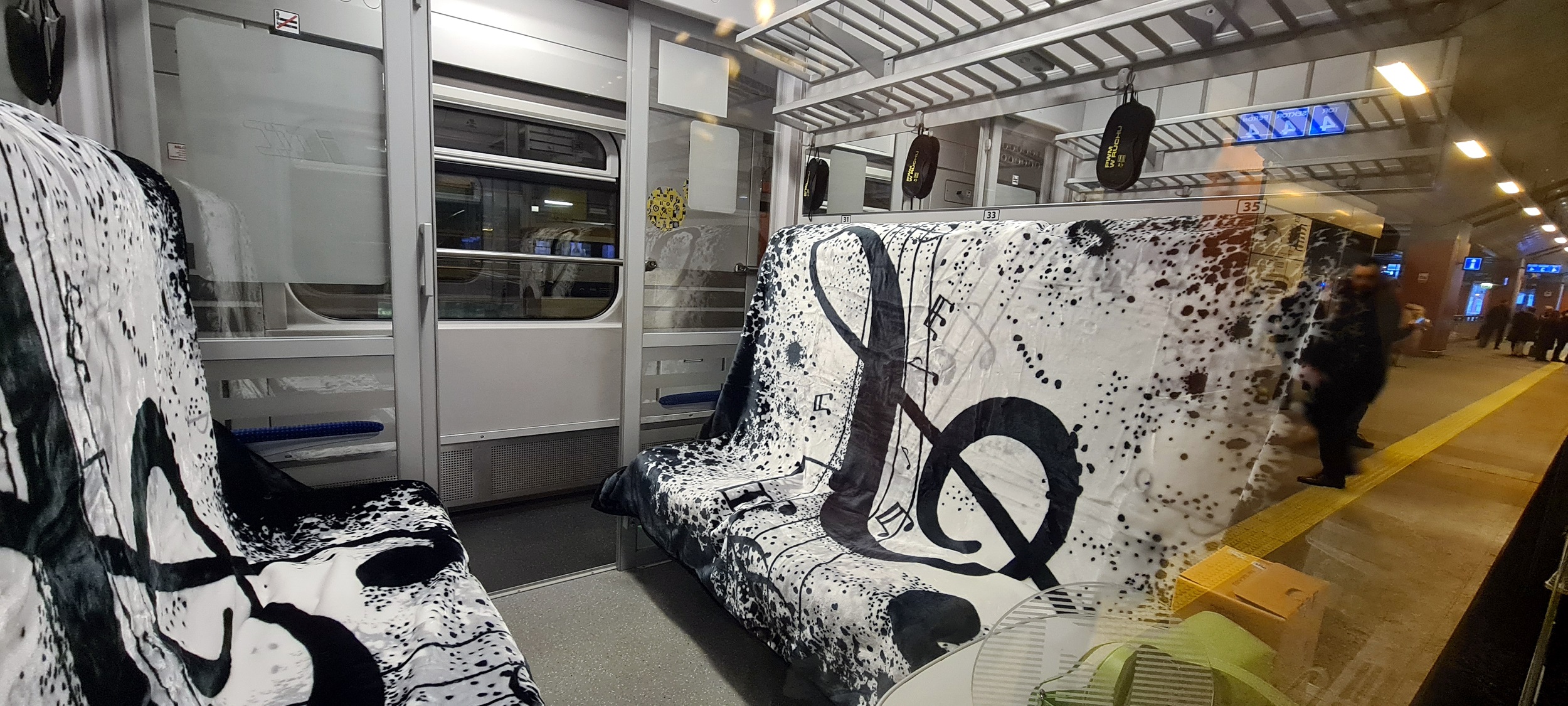 Wnętrze przedziału wagonu drugiej klasy, 50 51 20-78 610-6 B10nouz, w składzie pociągu specjalnego, uruchomionego z okazji 80 rocznicy powstania Polskiego Wydawnictwa Muzycznego. Przejazd odbędzie się na trasie Kraków Główny – Gdynia Główna, przez między innymi Częstochowę, Zduńską Wolę Karsznice, Łódź Widzew, Warszawę Centralną, Iławę Główną i Gdańsk Główny. (Kraków Główny, 2025-12-21) |