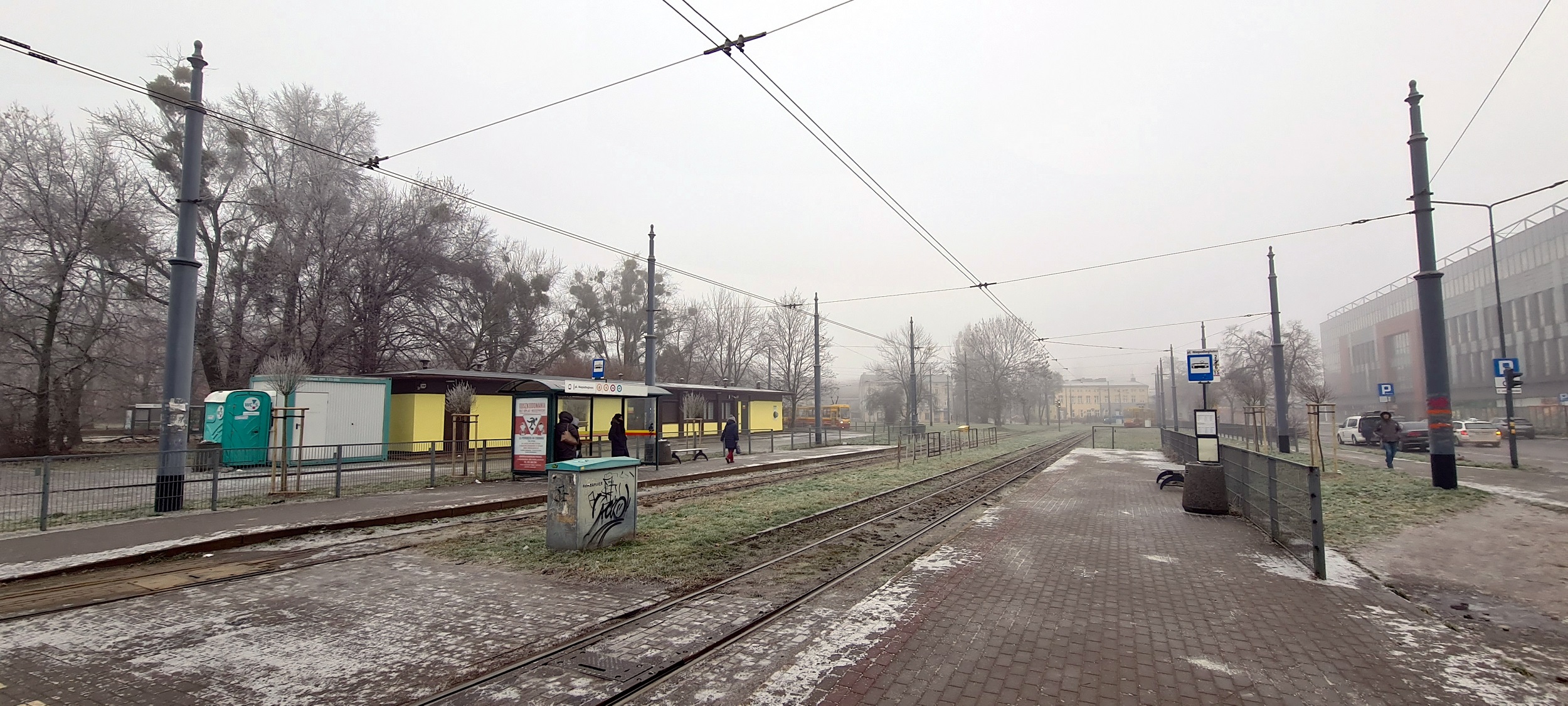 Perony przystankowe ujęte od zachodniej strony. (Łódź, 2025-12-28) |