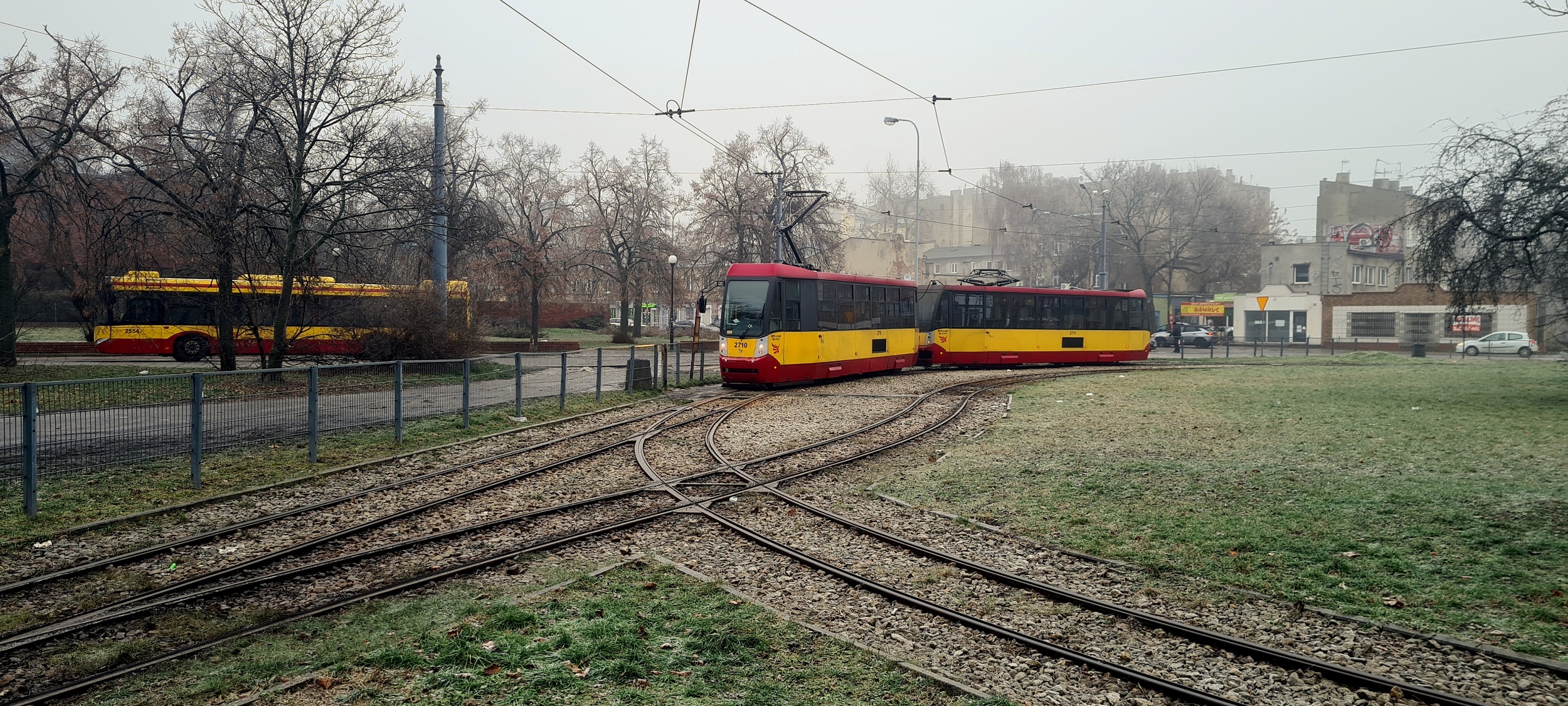 Tory po północnej stronie pętli. Z zewnętrznego wyprowadzony jest łuk, który po skrzyżowaniu z wewnętrznym pozwala wyjechać w Rzgowską, a nawet zrobić kółko po pętli i wrócić w to samo miejsce. (Łódź, 2025-12-28) |