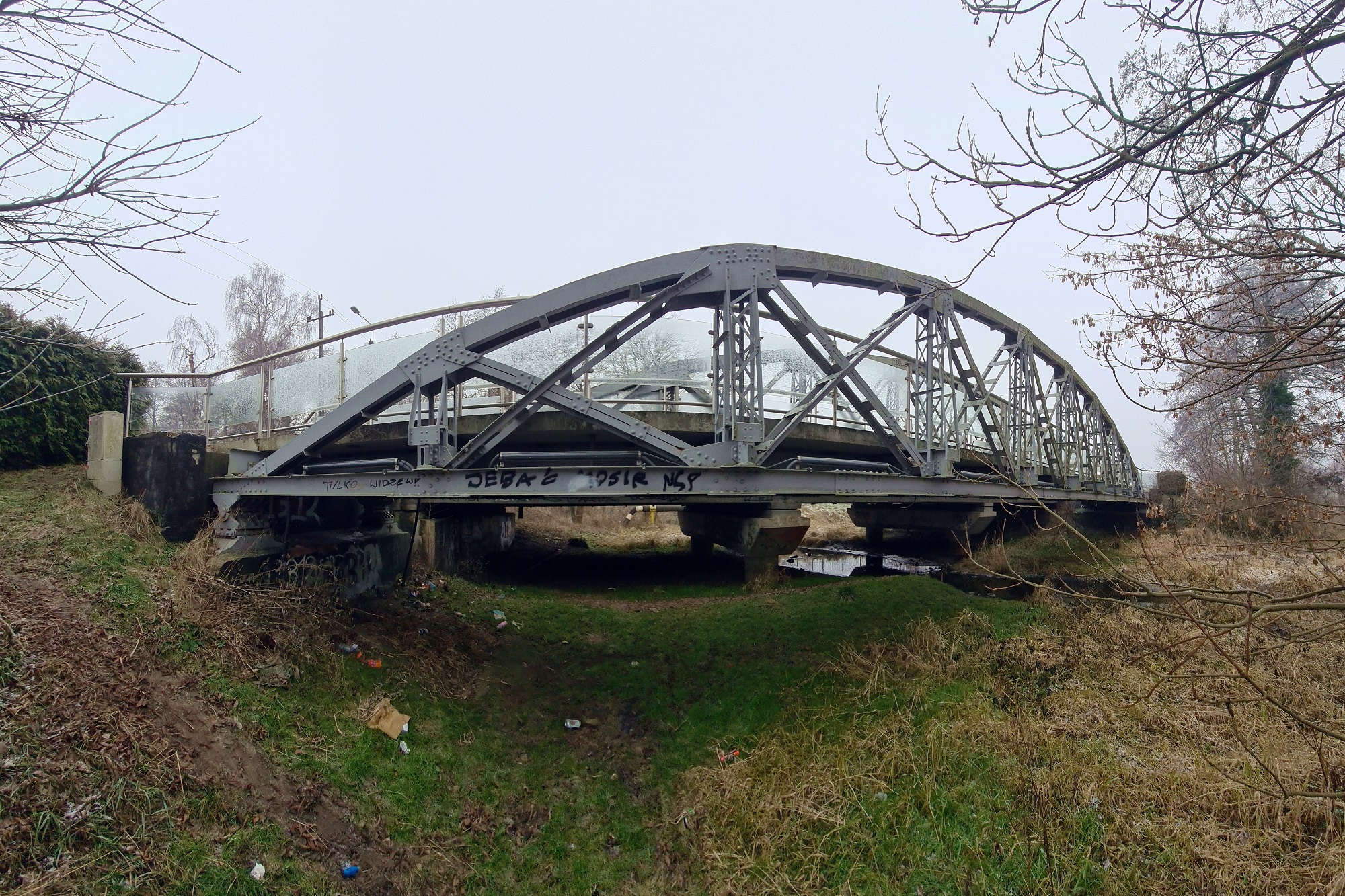 Stalowy, nitowany most tramwajowy przez Ner, oddany do użytku w 1916roku. Do 1993 roku poruszały się po nim tramwaje linii 42. Obecnie jest częścią ciągu pieszego. (Rzgów, 2025-12-28) |