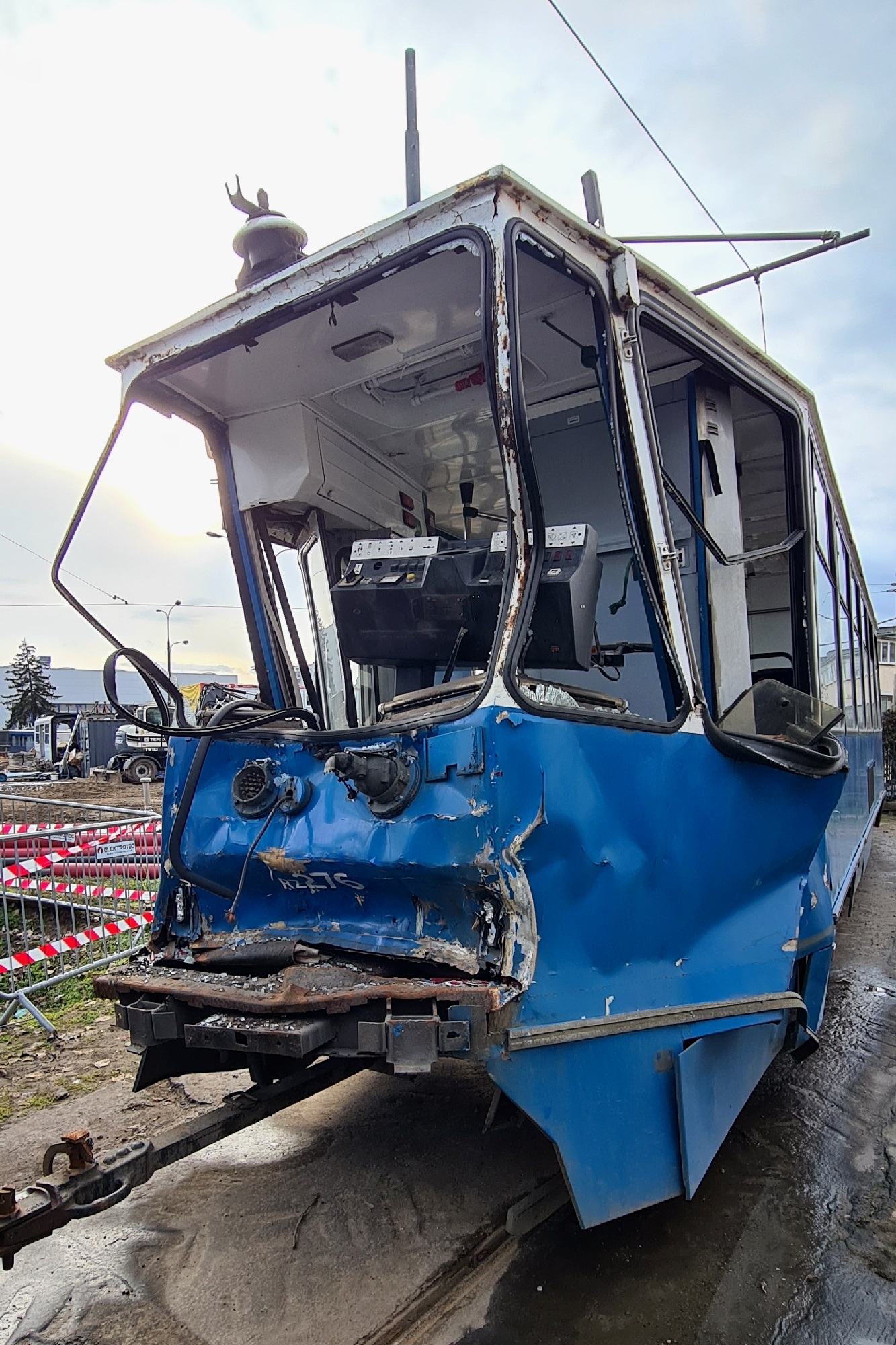 Rozbity drugi wagon trójskładu 105Na #273 + 105Na #276 + 105Na #275, odstawionego na torze od strony ulicy Rzemieślniczej.