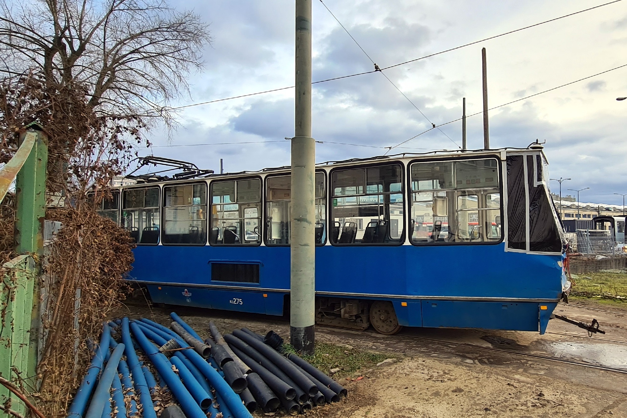 Rozbity trzeci wagon trójskładu 105Na #273 + 105Na #276 + 105Na #275, odstawionego na torze od strony ulicy Rzemieślniczej.