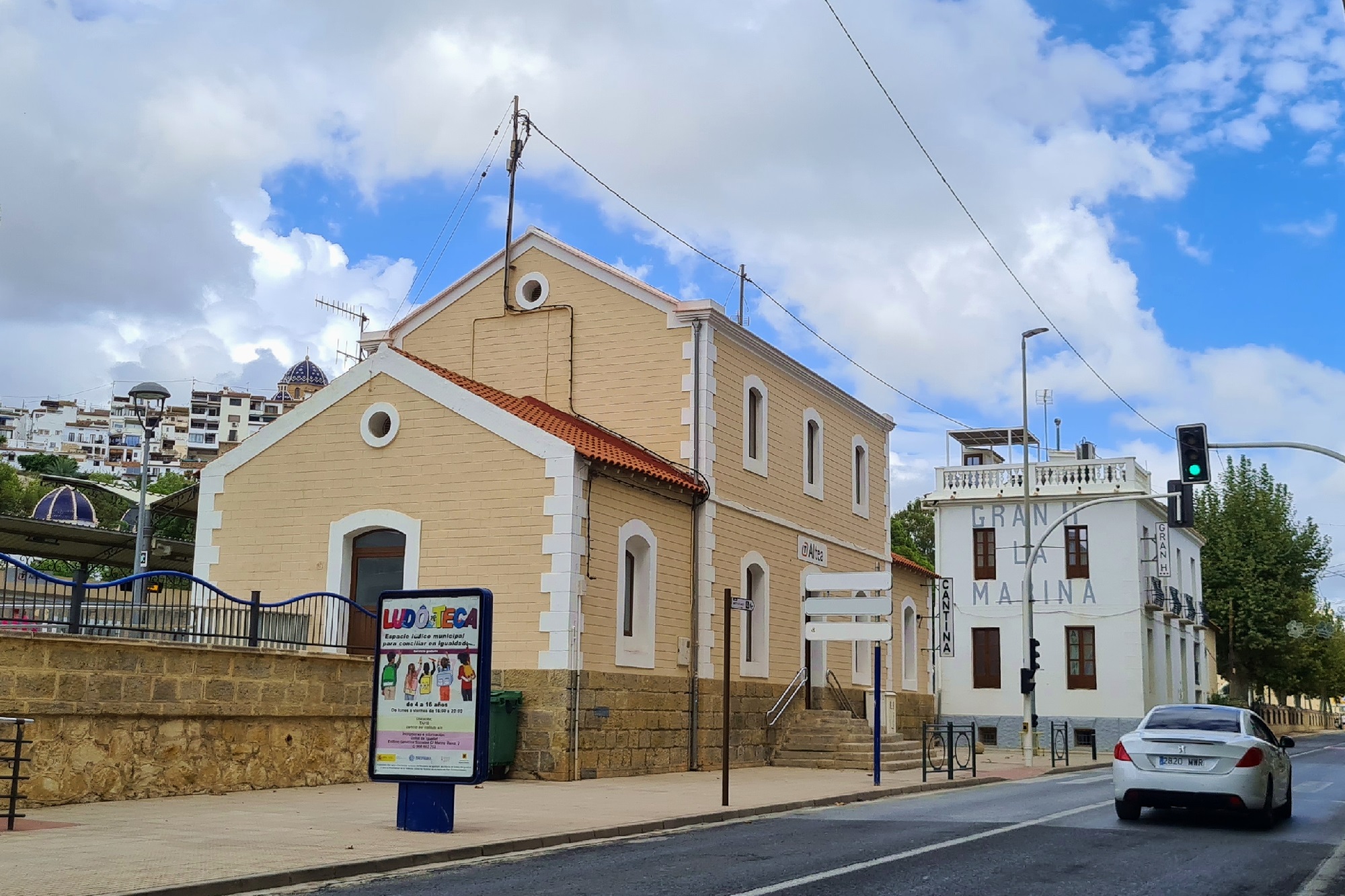 Budynek dworca dawnej wąskotorówki, ujęty od strony Carrer la Mar.