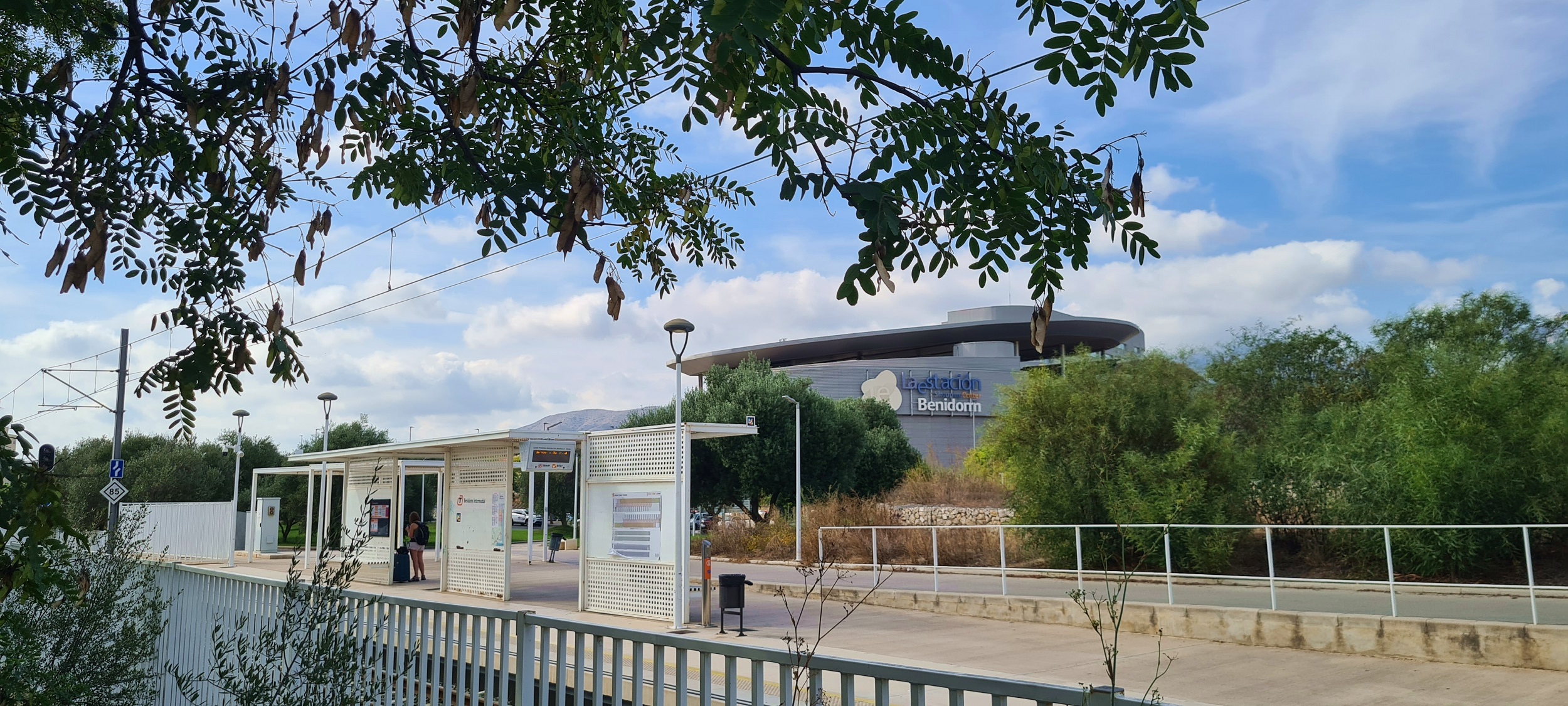Przystanek TRAM Metropolitano de Alicante, będący częścią węzła przesiadkowego, wraz z widocznym w tle kompleksem dworca autobusowego. (Benidorm Intermodal, 2025-09-27) |