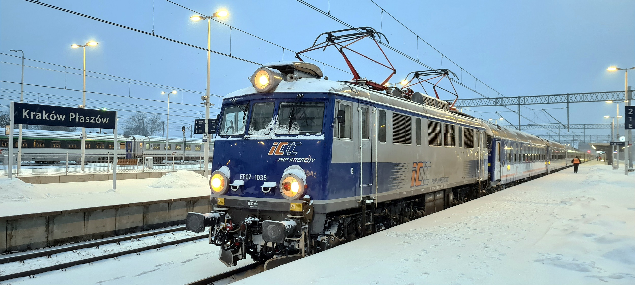EP07-1035 na czele składu opóźnionego niemal dwie godziny pociągu IC83172 „Podhalanin”, relacji Świnoujście - Zakopane. (Kraków Płaszów, 2026-01-13) |