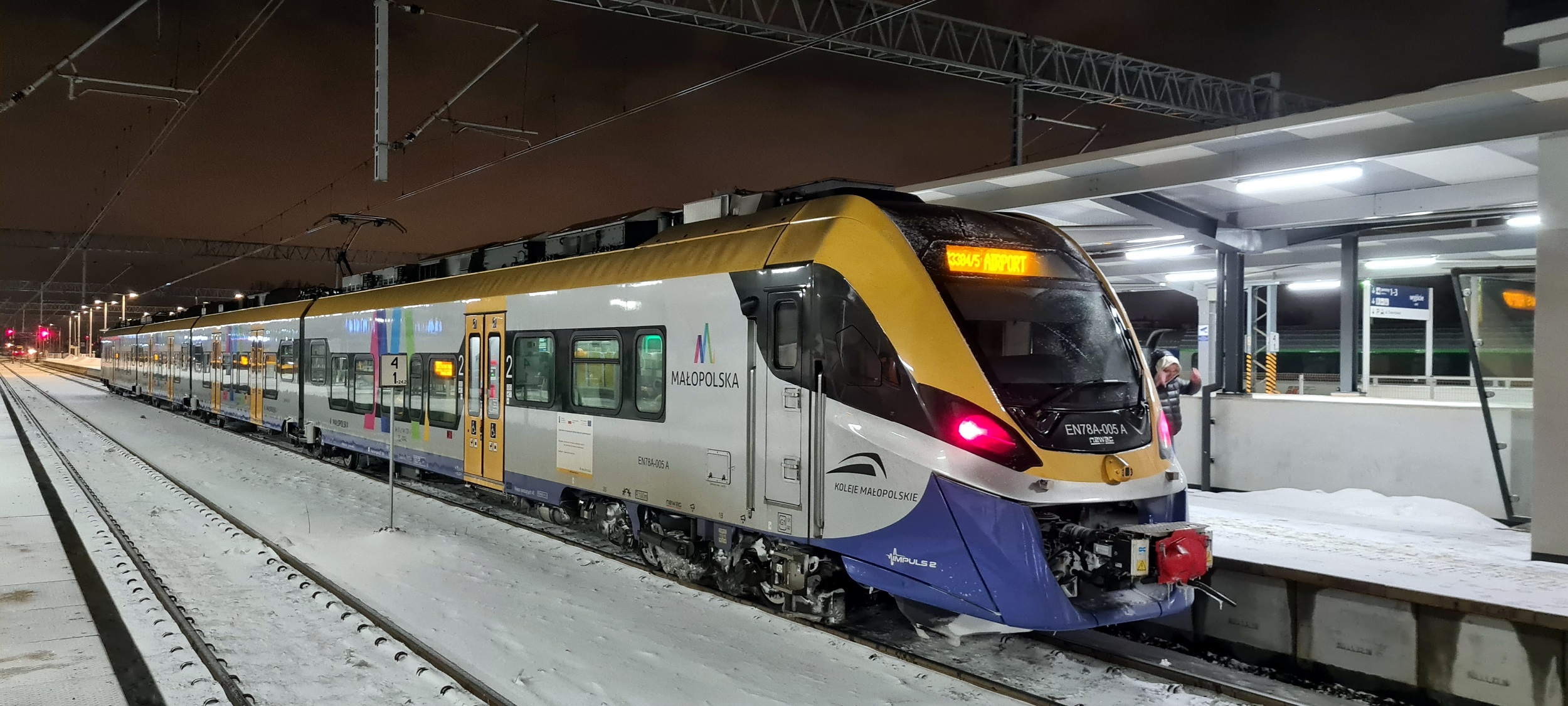 EN78A-005 jako pociąg KML33304 SKA1, relacji Wieliczka Rynek-Kopalnia – Kraków Lotnisko. (Kraków Płaszów, 2026-01-12) |