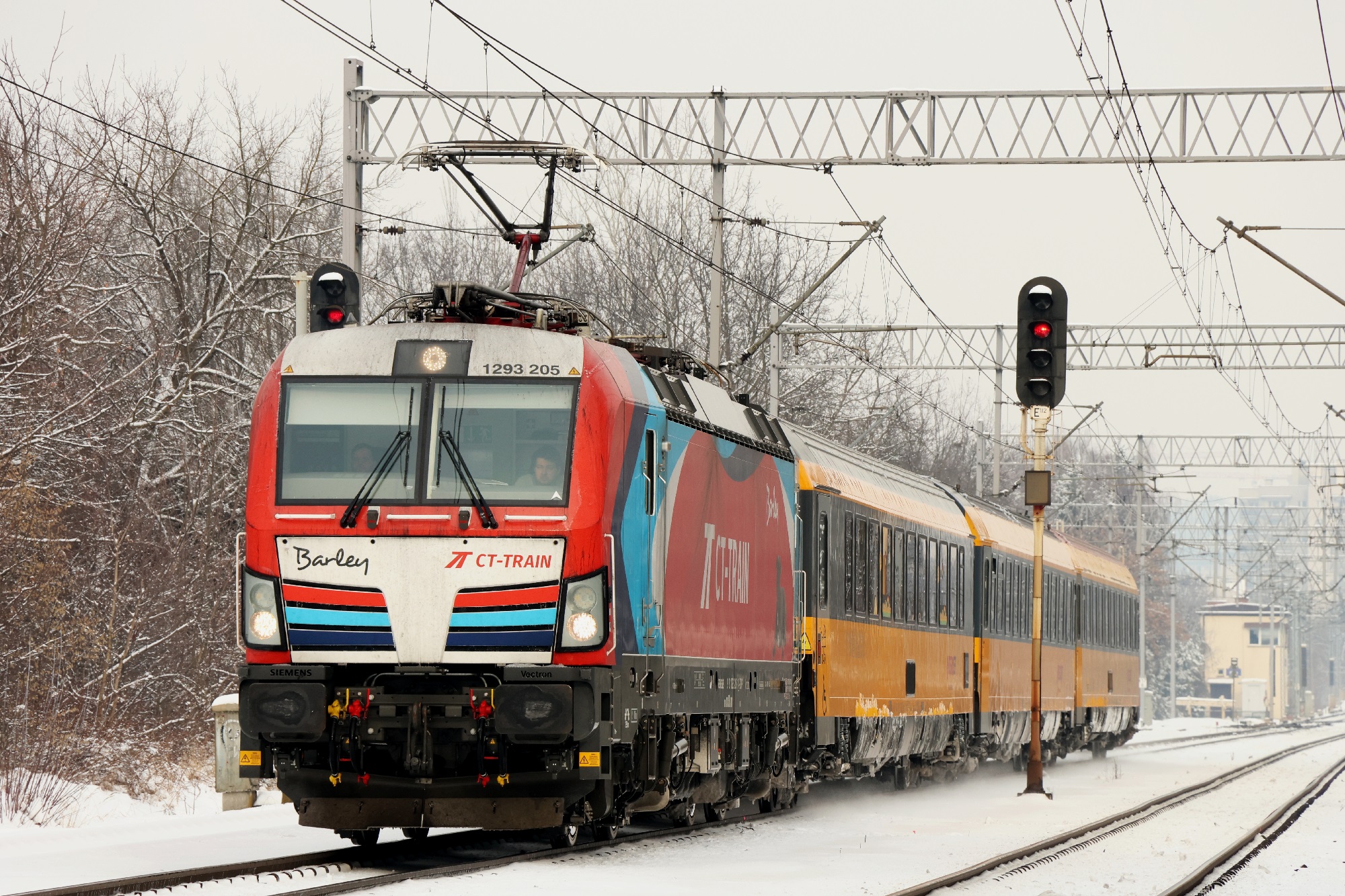 1293 205 na czele składu pociągu RJ5384/5 „REGIOJET”, relacji Gdynia Główna – Kraków Główny. (Kraków Przedmieście, 2026-01-14) |