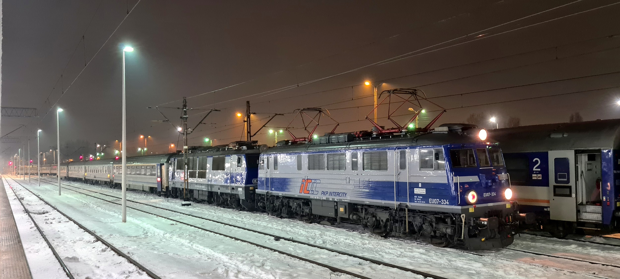 Na torze postojowym skład po pociągu TLK73104 „Kozica”, relacji Poznań Główny – Kraków Główny. Na czele EU07-334, za nią „zimna” EP09-038. (Kraków Płaszów, 2026-01-14) |