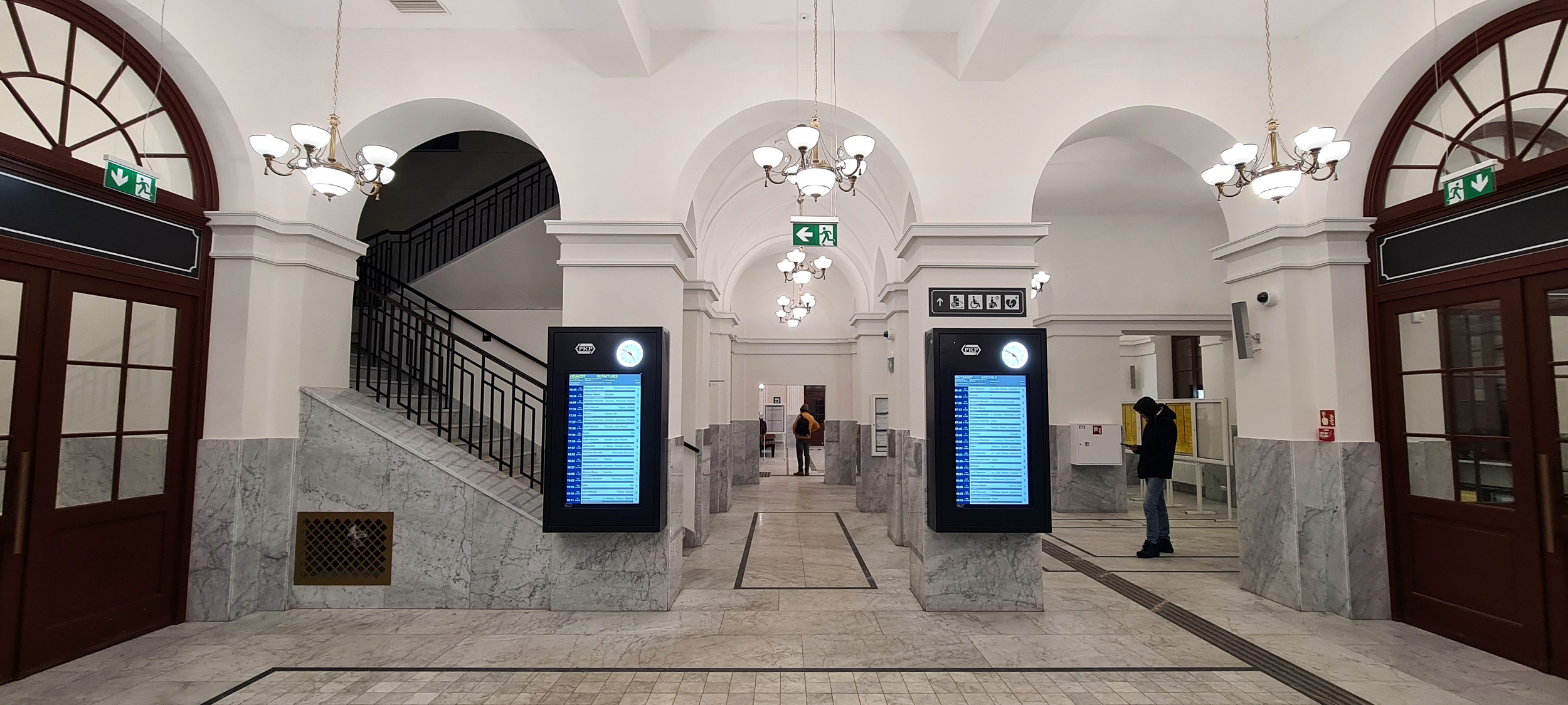 Hol główny, w centralnej części budynku dworca Pomiędzy tablicami SIP, przejście do poczekalni i kas, w zachodnim skrzydle. (Skierniewice, 2026-01-18) |