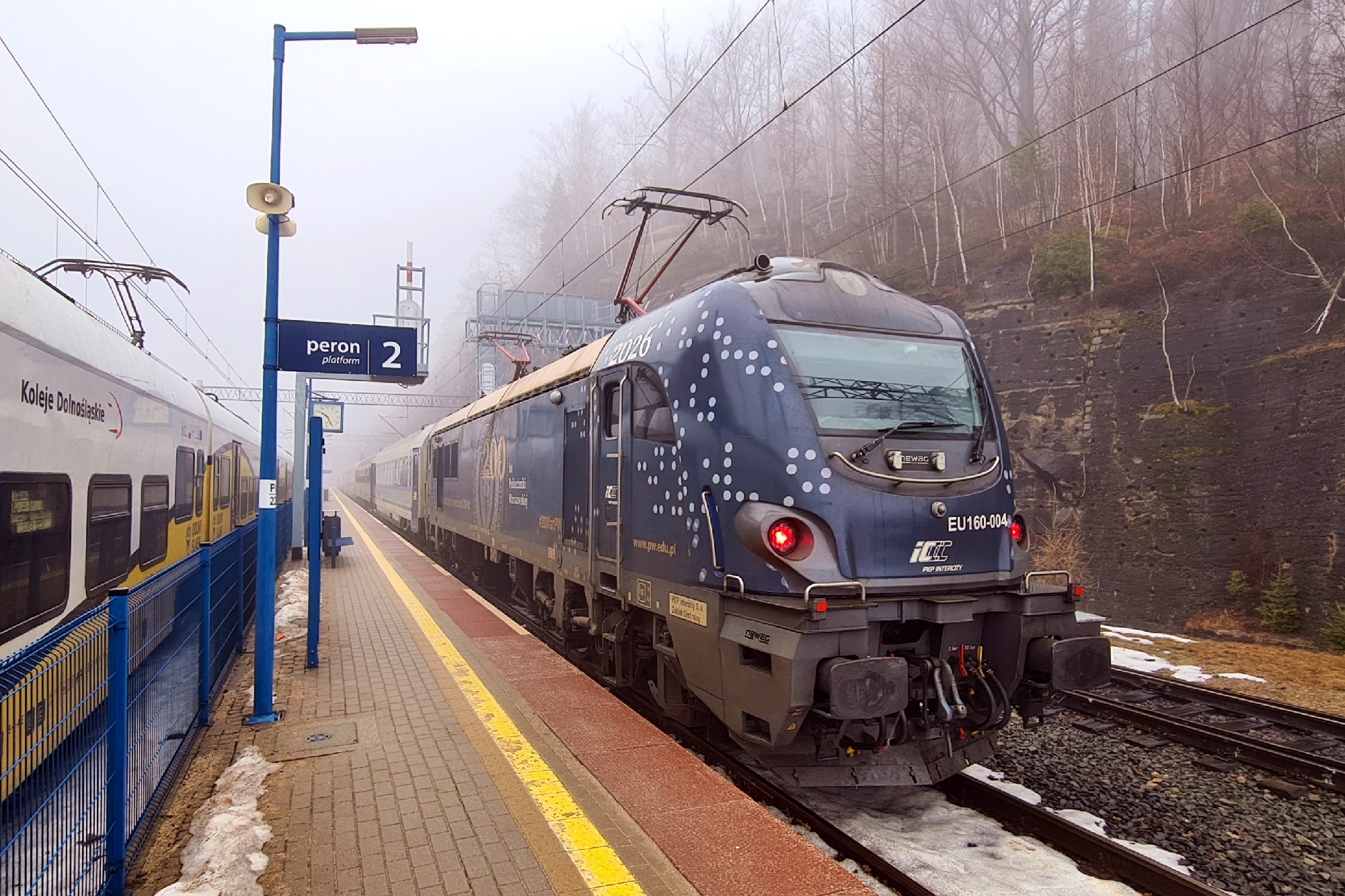 2026, 2026-02-08, Luty, Luty2026, Dolnośląskie, DolnyŚląsk, SzklarskaPoręba, SzklarskaPorębaGórna, PKP, PKPIC, Newag, Griffin, E4DCU, EU160, EU160-004, Okleina, 200LatPolitechnikiWarszawskiej, IC6138, Orzeszkowa |