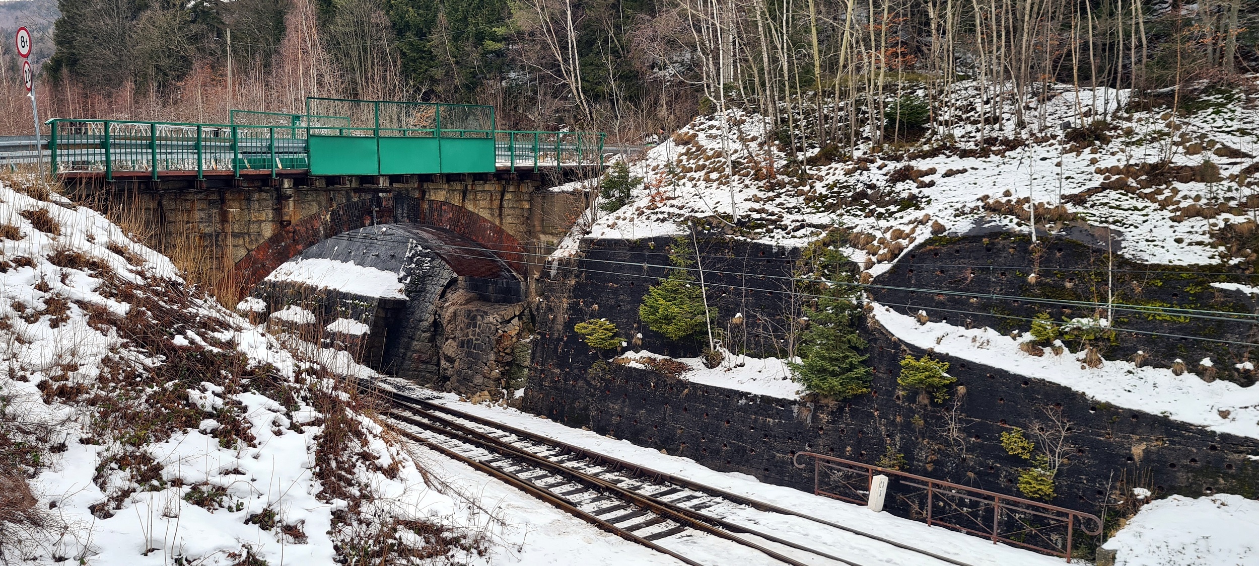Zachodnia głowica rozjazdowa. W kadrze wiadukt drogowy w ciągu ul. Wolności i (w prawym, dolnym rogu kadru) przepust nad jednym z dopływów Kamiennej. (Szklarska Poręba Górna, 2026-02-05) |