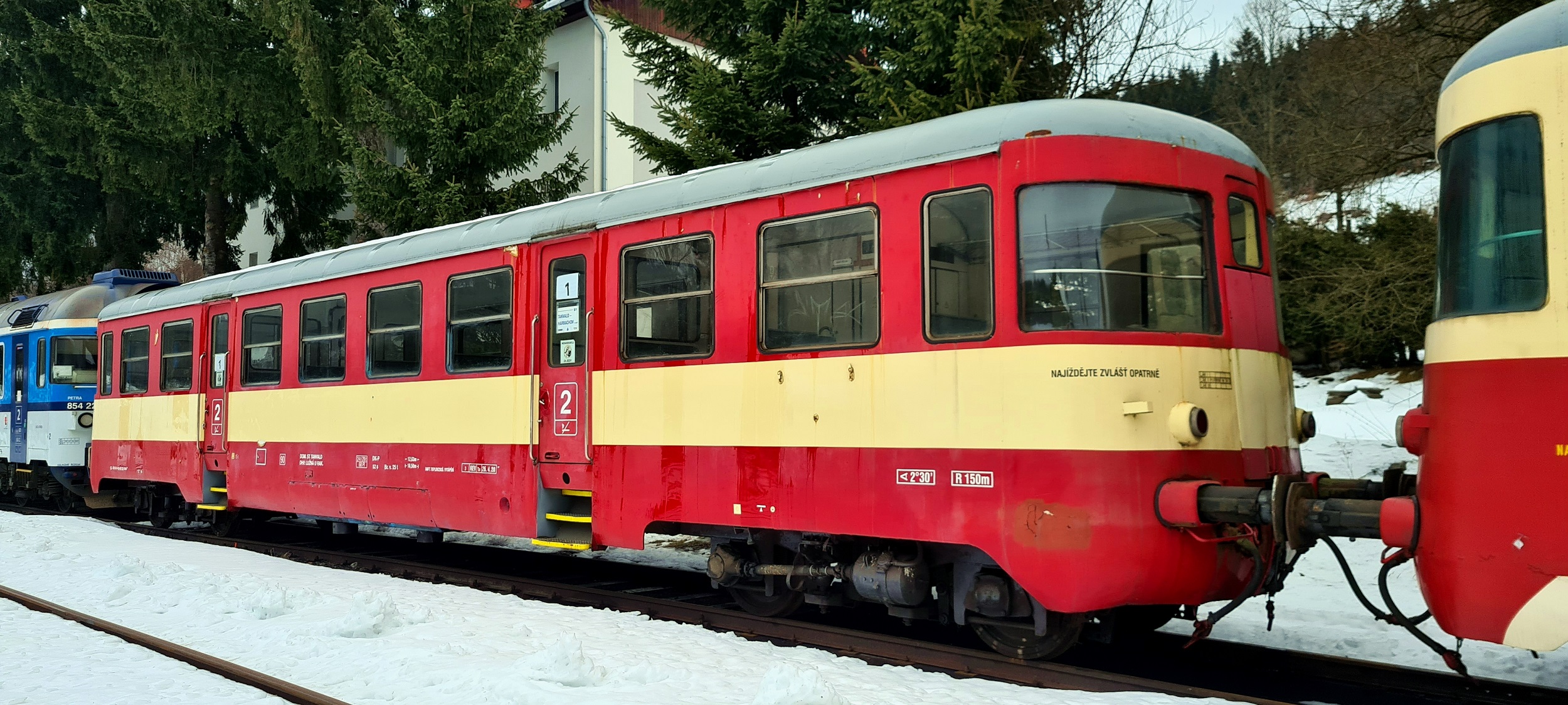 Doczepka serii 020 w składzie z motorakiem 854 225-0 i drugą doczepą , zimująca na skrajnie północnym torze stacji. (Kořenov, 2026-02-05) |