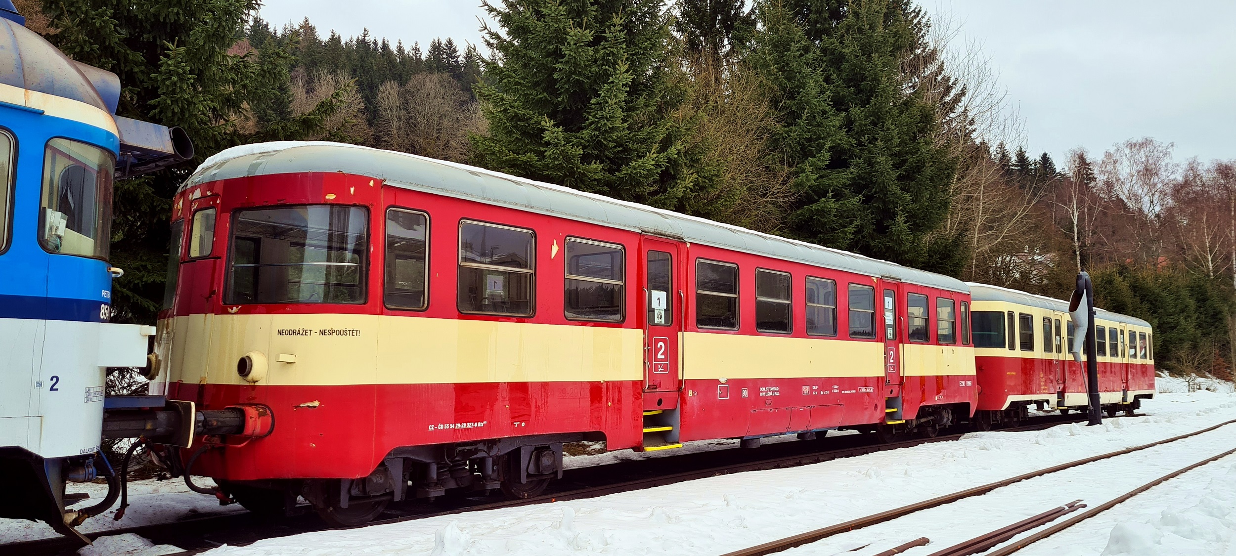 Doczepka serii 020 w składzie z motorakiem 854 225-0 i drugą doczepą , zimująca na skrajnie północnym torze stacji. (Kořenov, 2026-02-05) |