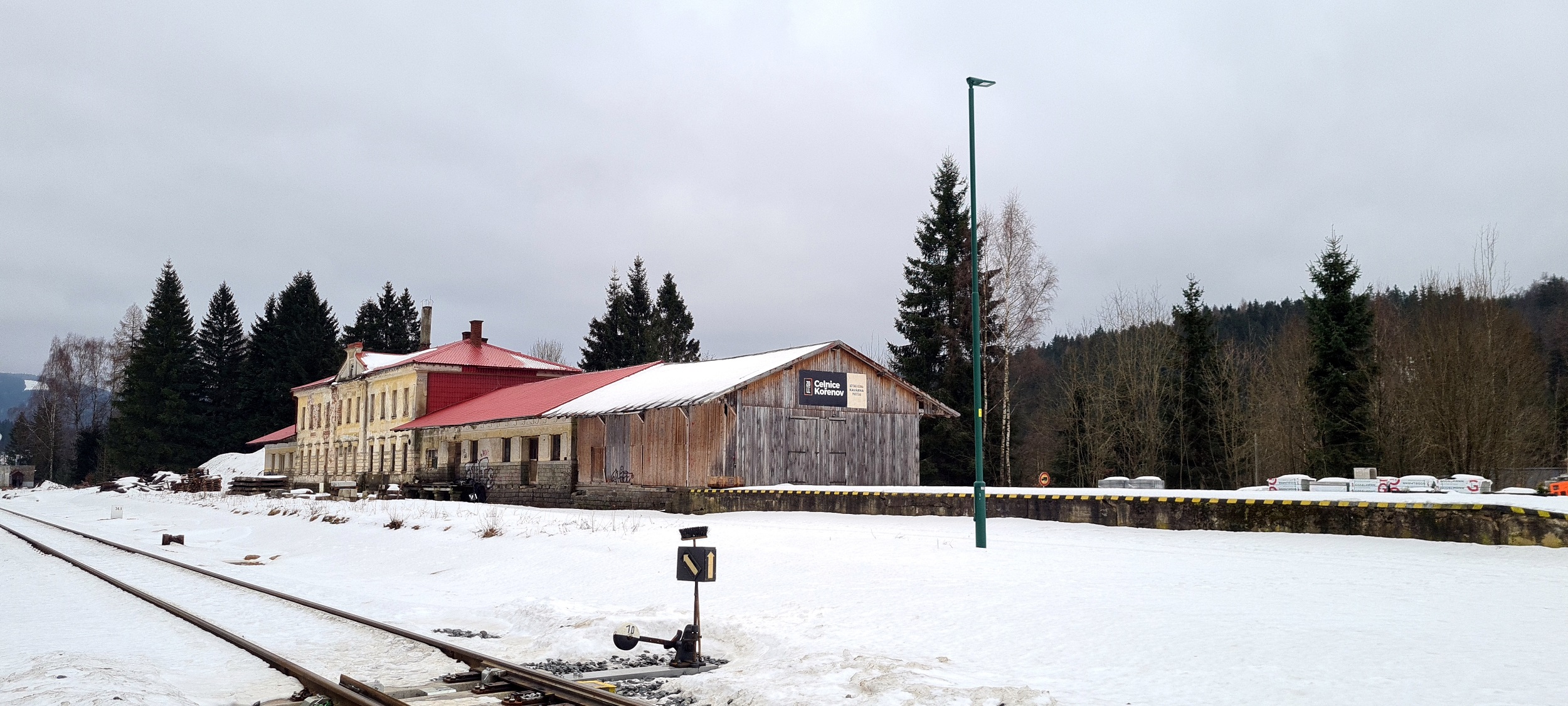 Zabudowania dawnego urzędu celnego i składu z ładownią. W chwili wykonywania zdjęcia znajdował się tu lokal gastronomiczny. (Kořenov, 2026-02-05) |